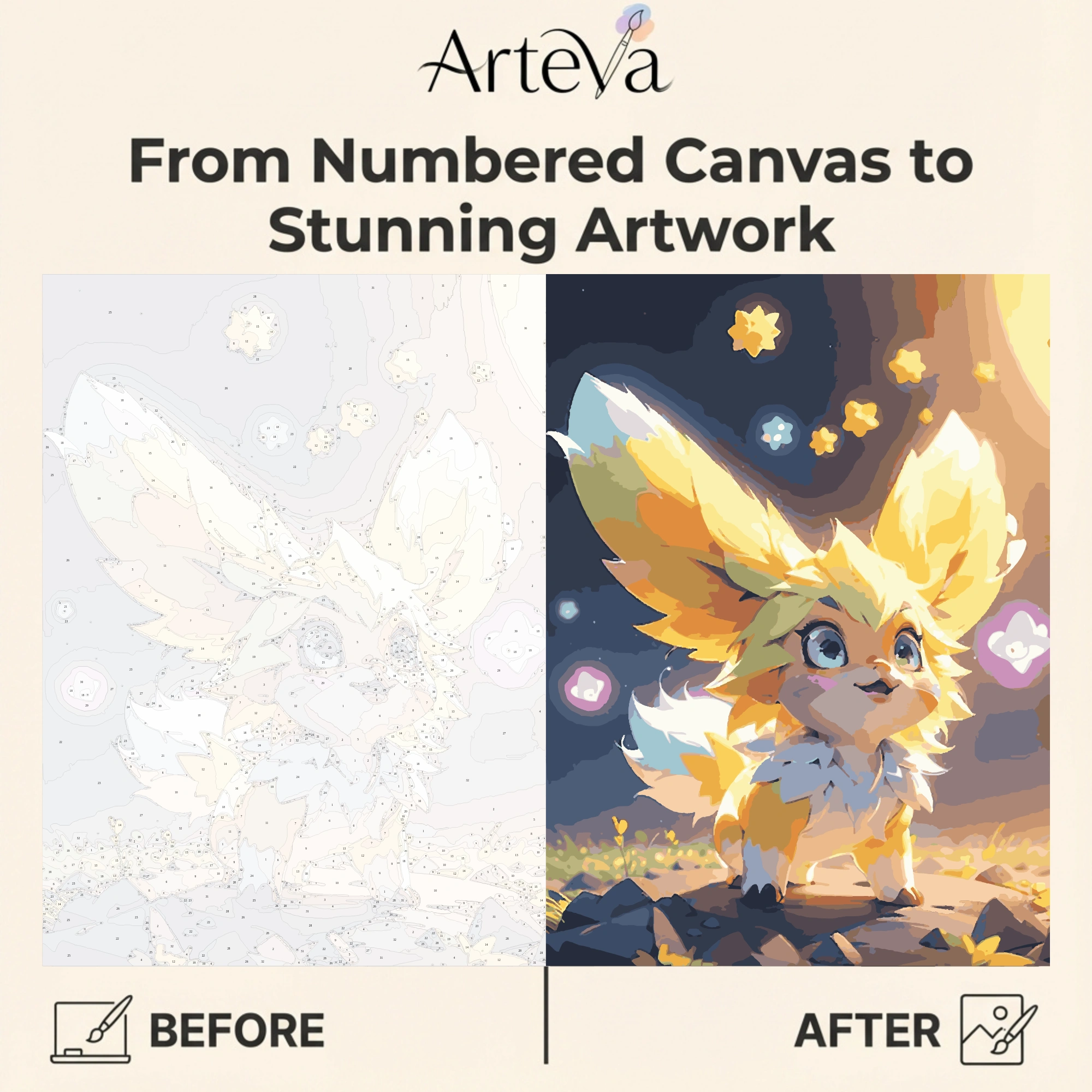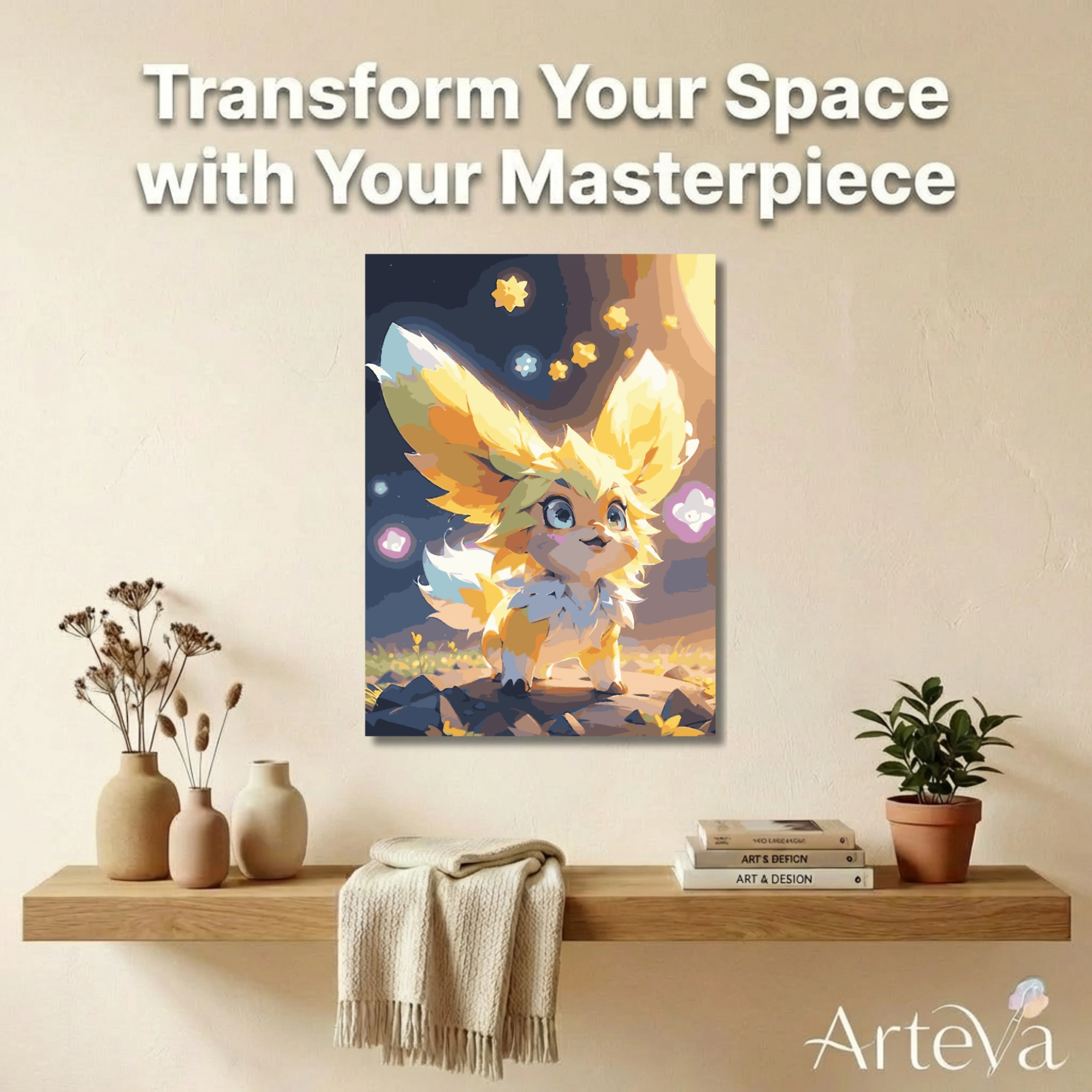 همس النجوم هي لوحة تلوين بالأرقام تأخذك إلى عالم أنمي حالم، حيث يقف ثعلب صغير بملامح بريئة وآذان كبيرة لامعة فوق صخور هادئة، بينما تتلألأ النجوم من حوله وتنساب الإضاءة الذهبية كأنها ضوء قمرٍ دافئ. الخلفية الليلية العميقة مع الوهج الأصفر تمنح المشهد سحراً خاصاً يجمع بين البراءة والدهشة.
