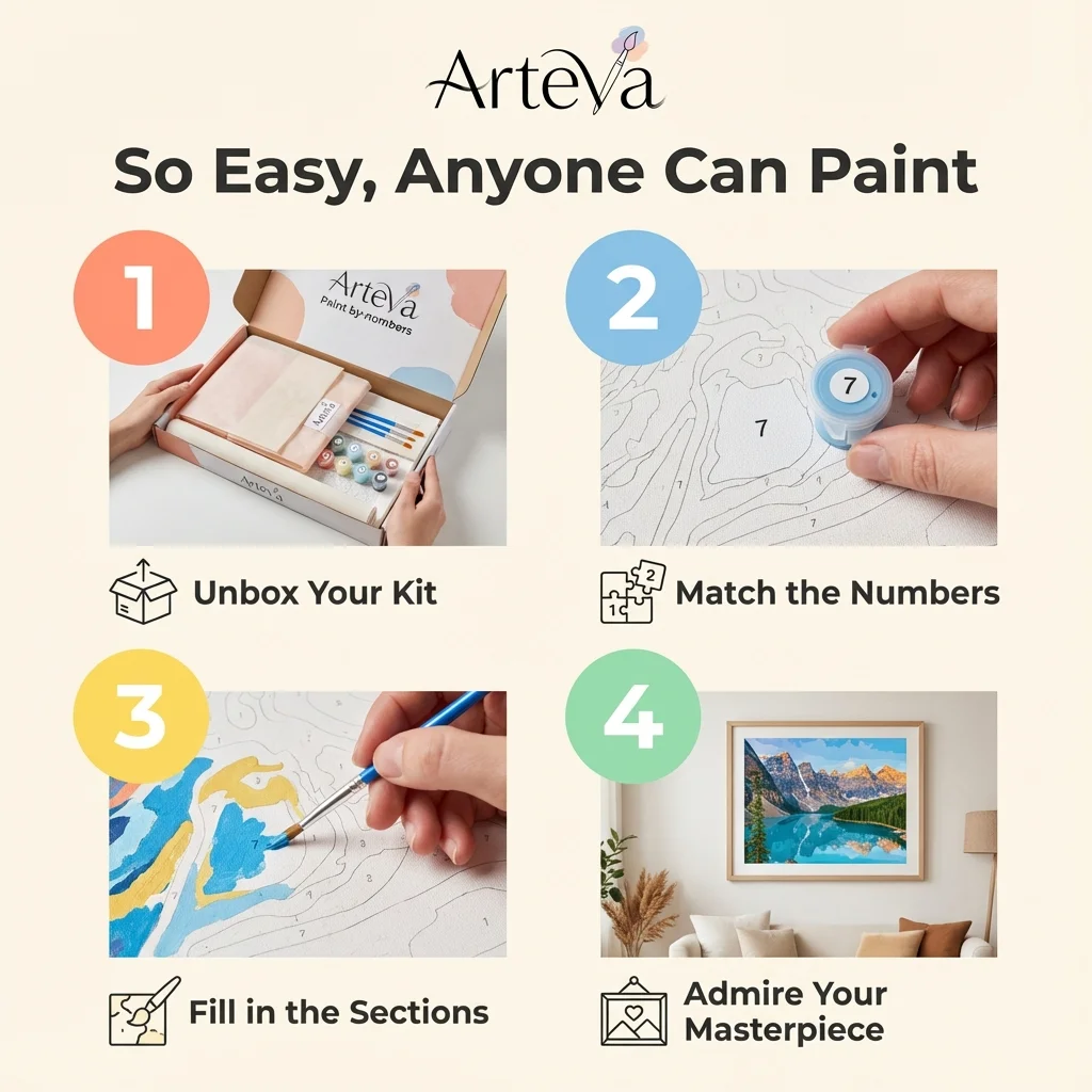 تدرجات الألوان بين الأزرق الليلي والذهبي والكريمي تصنع تناغماً بصرياً مريحاً للعين، وتجعل عملية التلوين ممتعة حتى للمبتدئين. التفاصيل الناعمة في الفرو والضوء تضيف عمقاً لطيفاً دون تعقيد مبالغ، فتخرج اللوحة متوازنة وجذّابة بعد الإكمال.