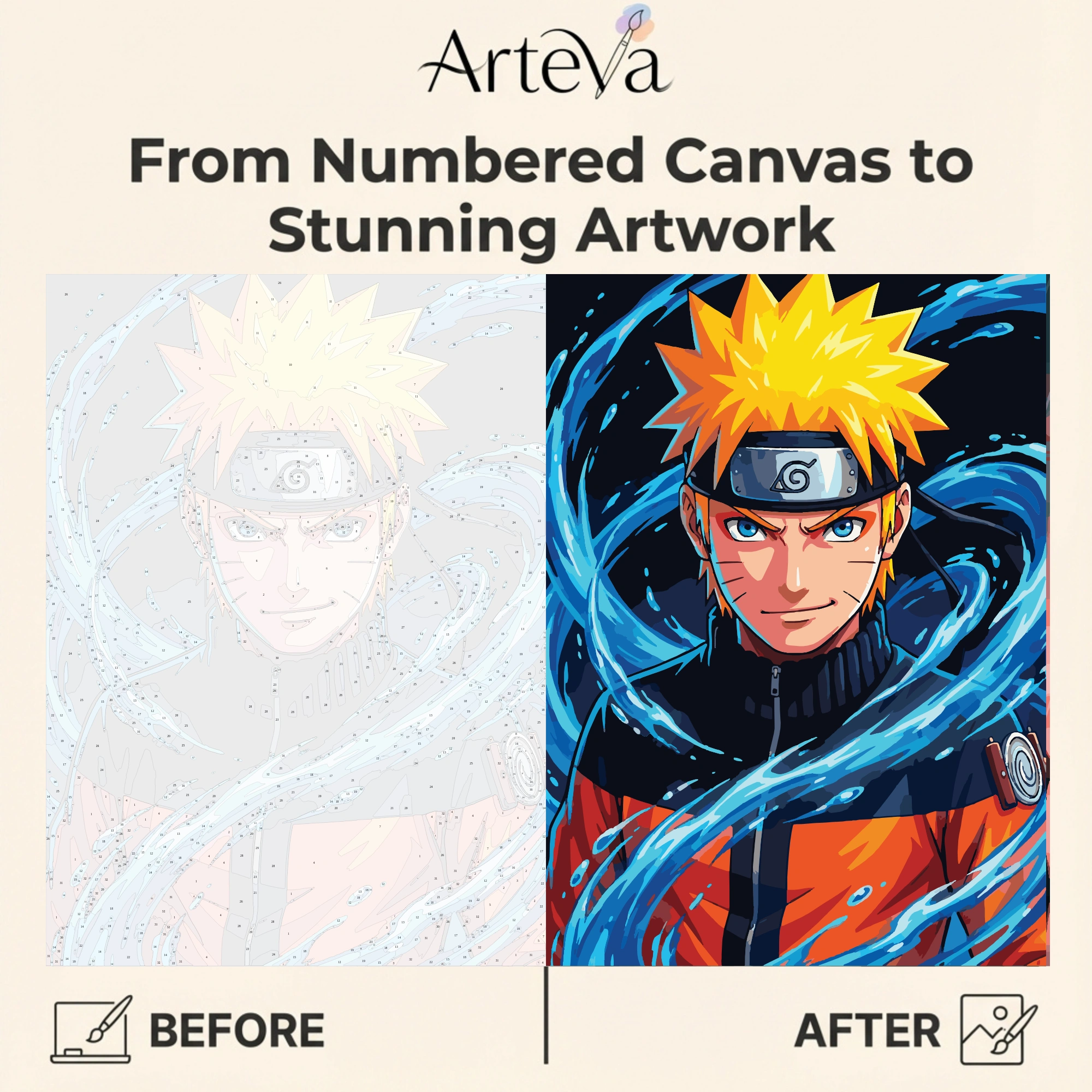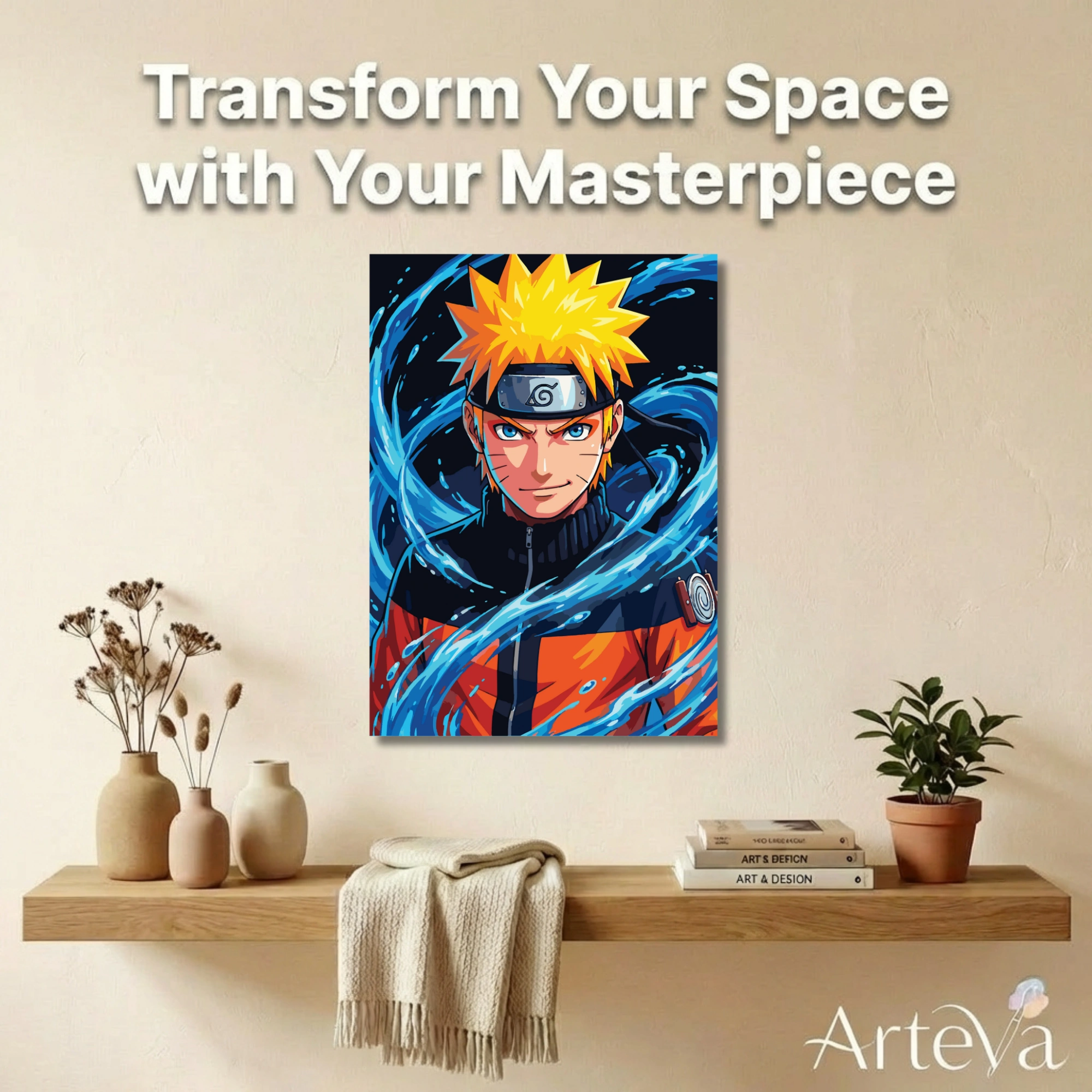 يتوازن الأزرق البارد للماء مع البرتقالي الدافئ للزي، لتخرج لوحة عالية التباين تبدو مثل بوستر احترافي بعد الإكمال. مناسبة لتعليقها في غرفة الشباب، ركن الأنمي/الألعاب، أو المكتب لمحبي الأعمال الحماسية.