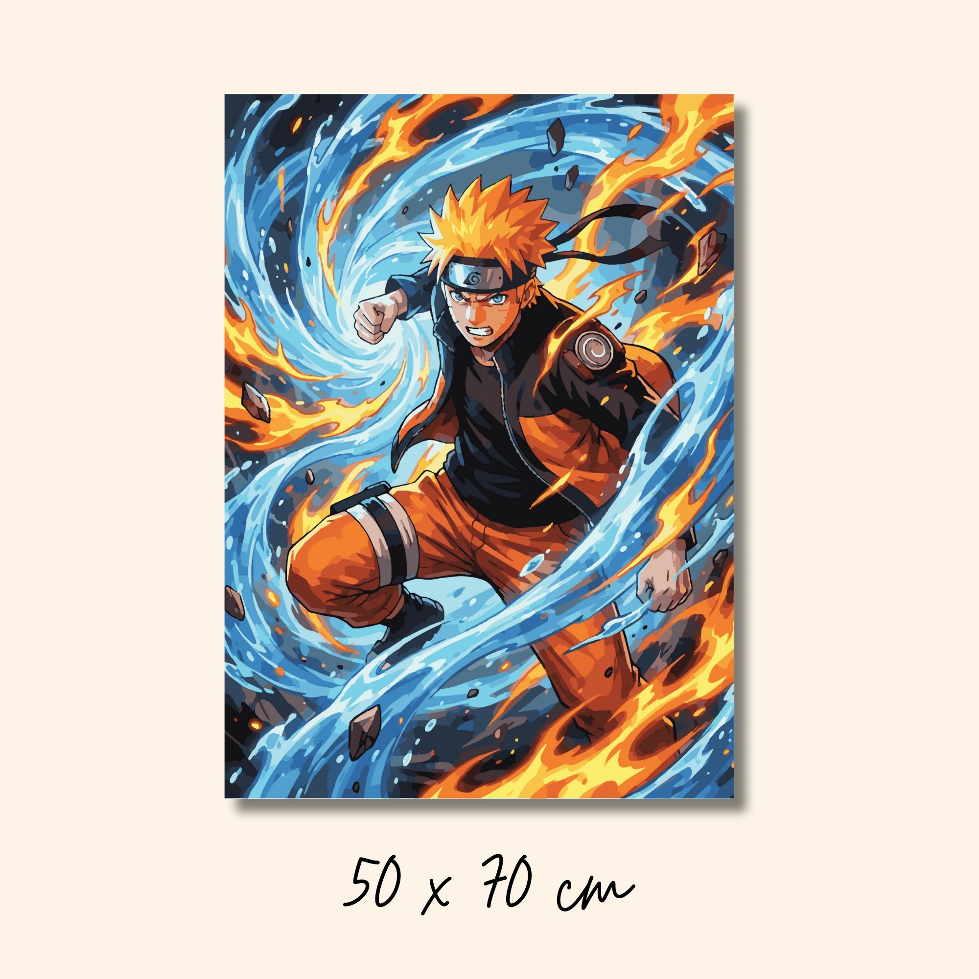 لوحة تلوين بالأرقام لمشهد أكشن أنمي لمحارب يقفز وسط دوامات ماء زرقاء ولهب برتقالي، تباين قوي وتفاصيل تمنح نتيجة بوستر جدارية مذهلة.