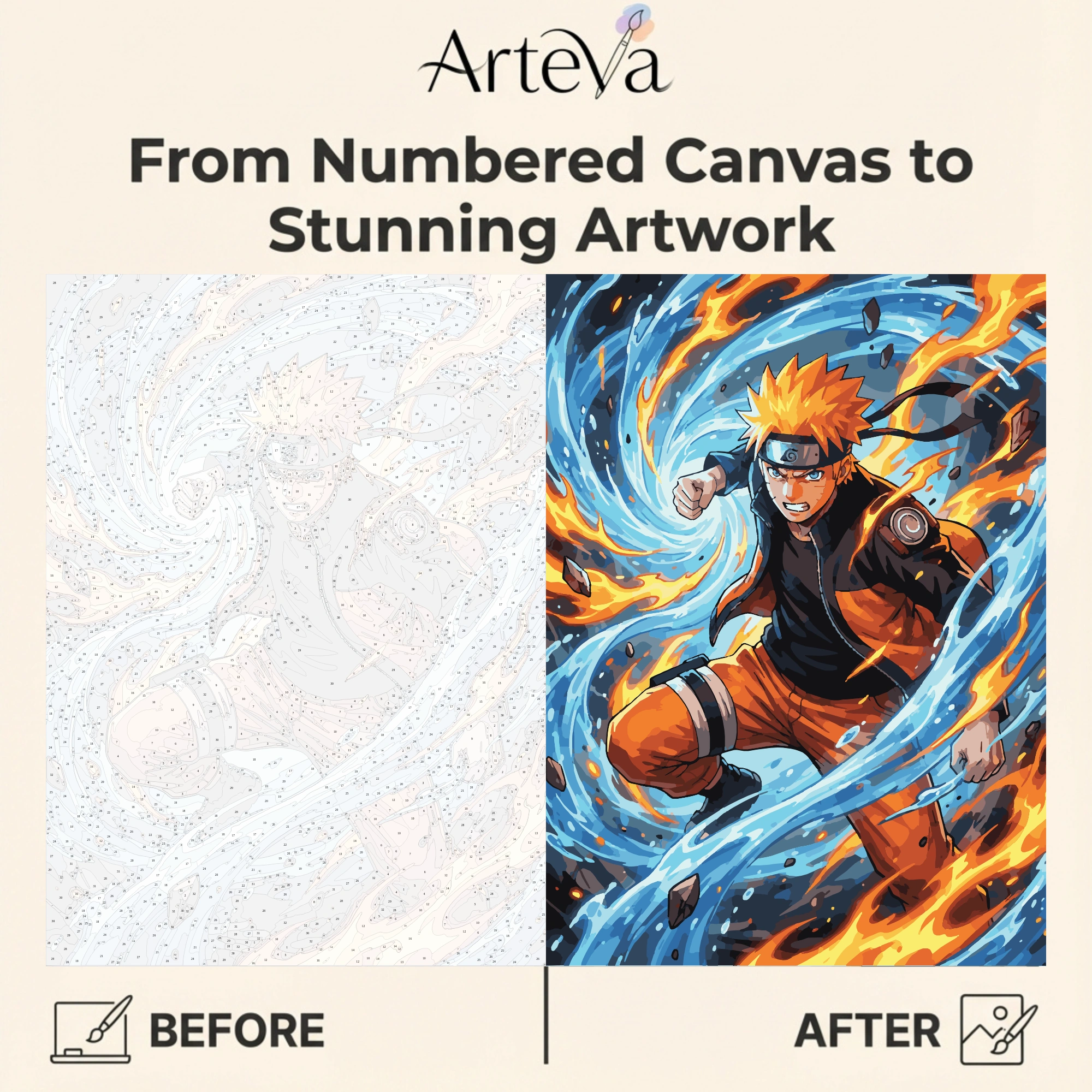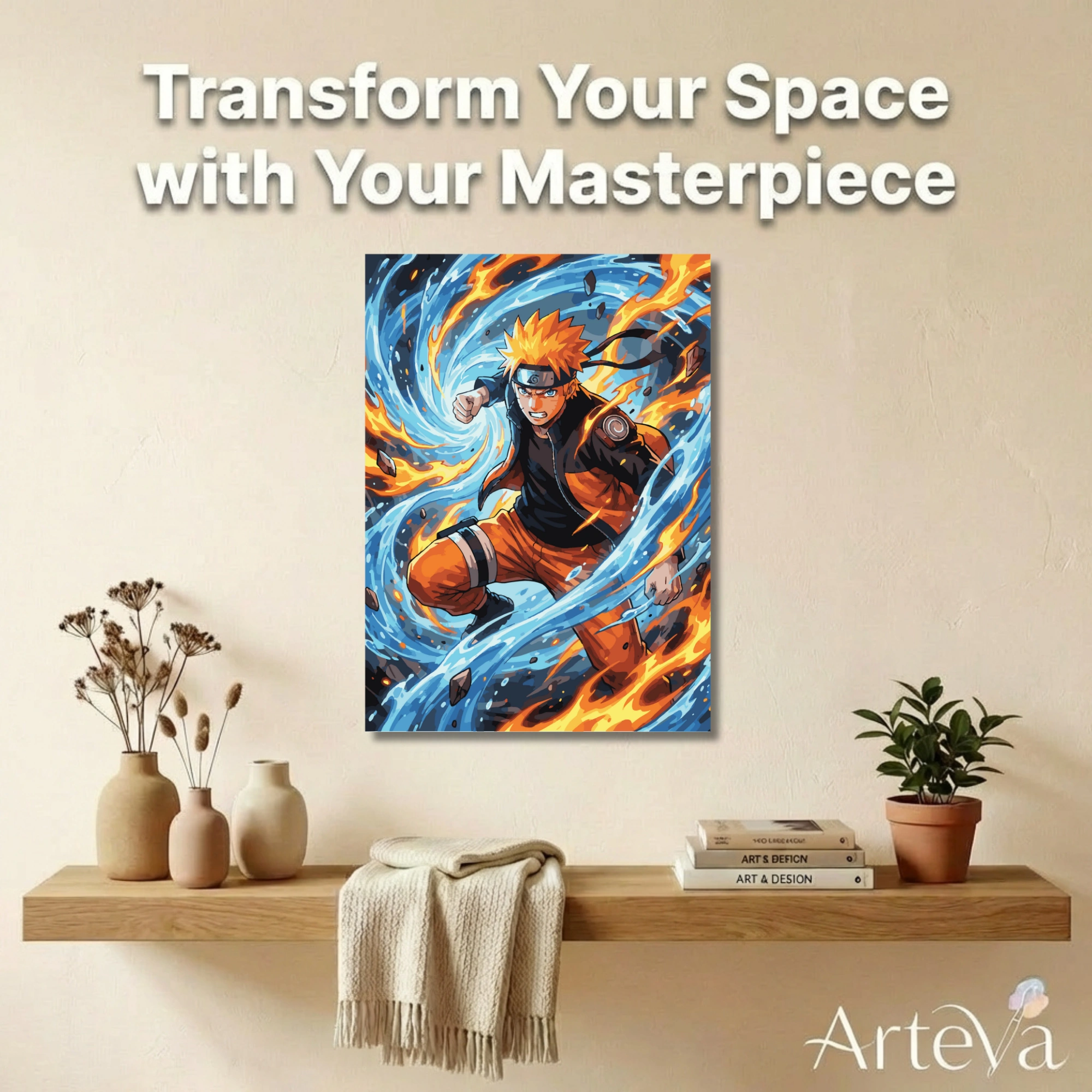 صدام العناصر هي لوحة تلوين بالأرقام بطابع أنمي حماسي تلتقط لحظة اندفاع قوية: محارب في حركة قفز وهجوم، يحيط به إعصار مائي أزرق يتشابك مع ألسنة لهب برتقالية متوهجة، بينما تتطاير شظايا الصخور لتزيد المشهد دراما وحركة.