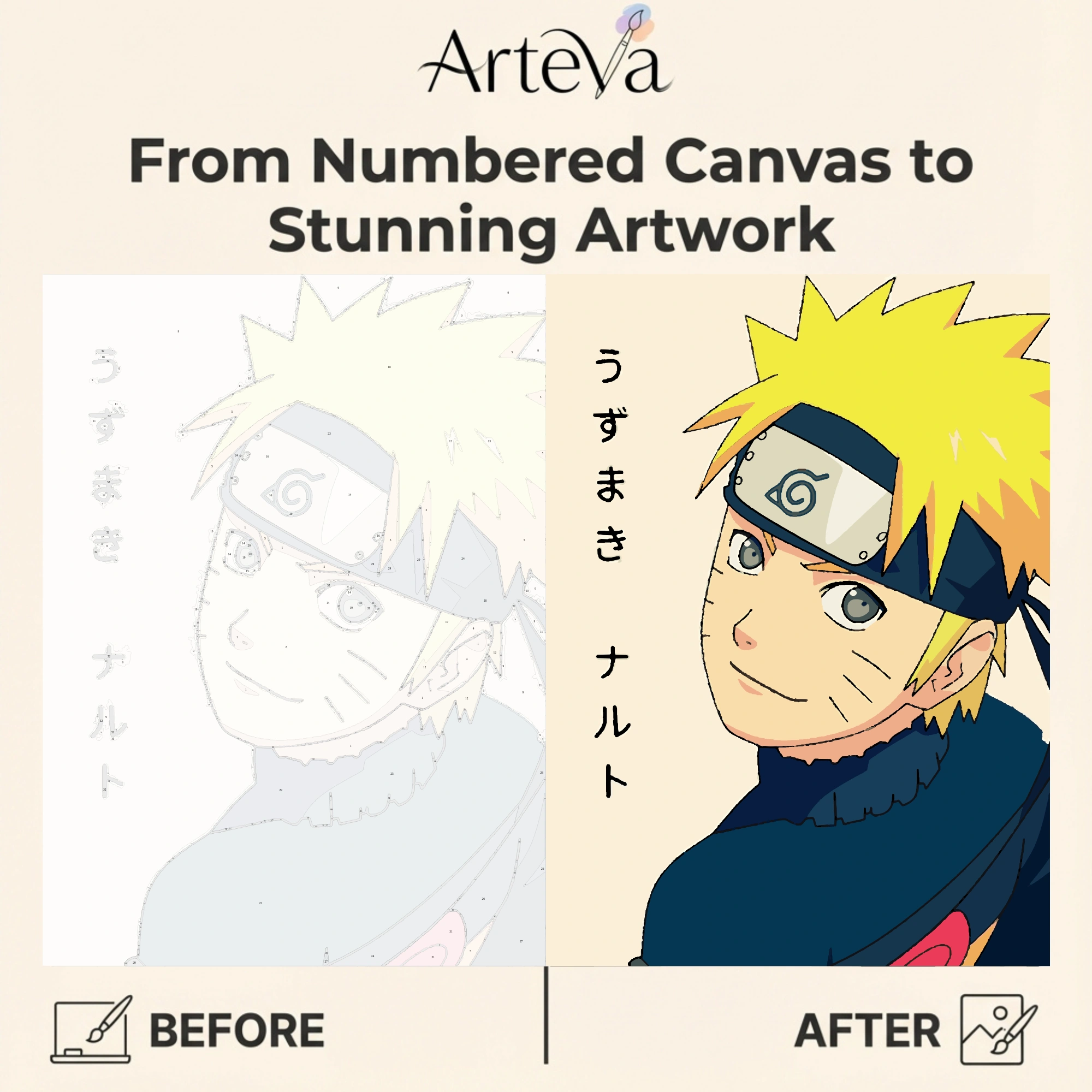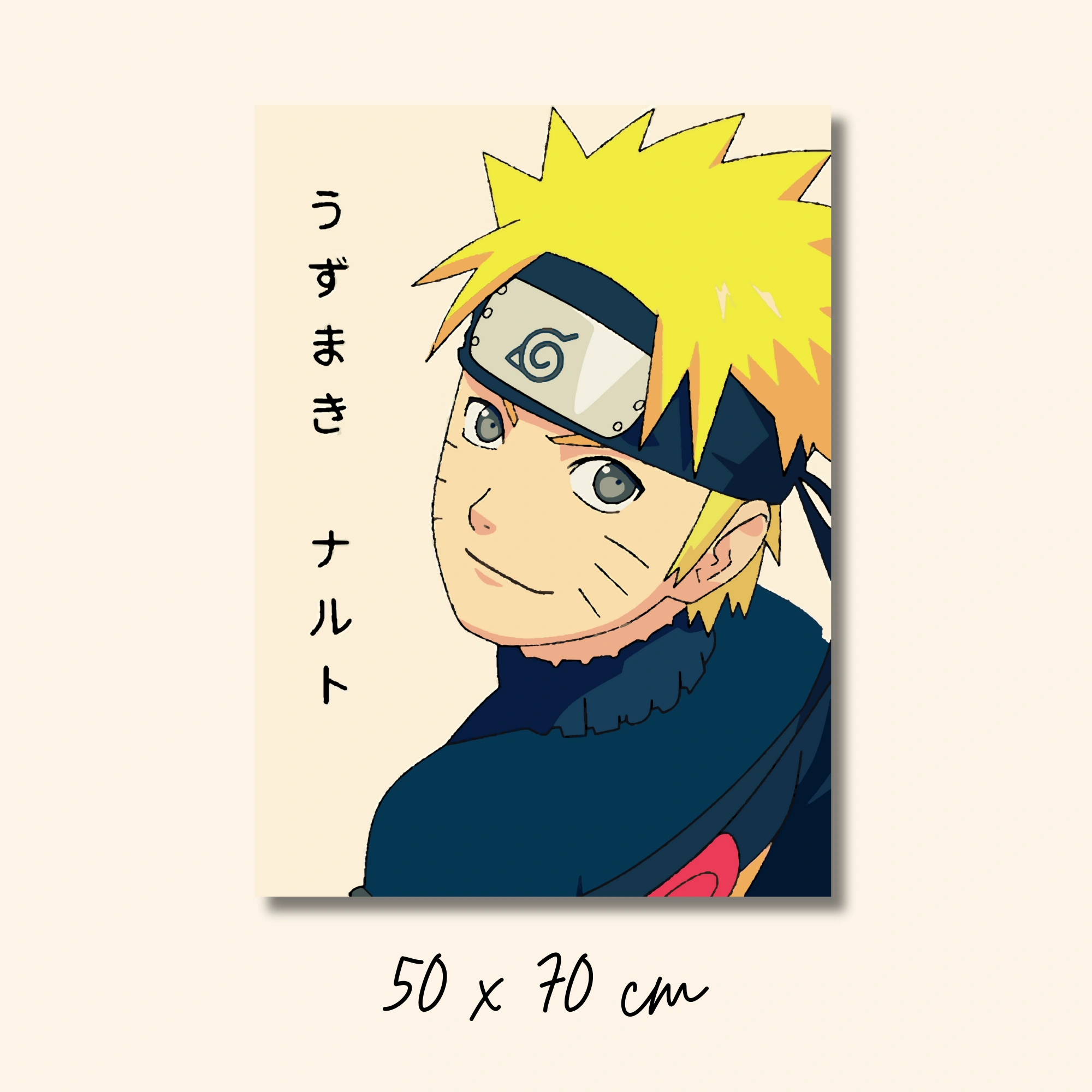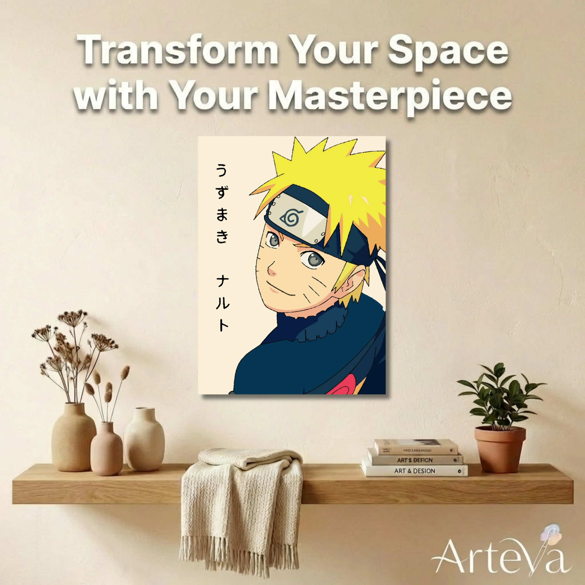 ملصق النينجا الكلاسيكي هي لوحة تلوين بالأرقام بتصميم أنمي بسيط يعتمد على الخطوط الواضحة والمساحات اللونية النظيفة. يظهر البطل بزاوية مائلة وابتسامة خفيفة تمنح إحساساً ودوداً ومريحاً، مع خلفية فاتحة تُبرز ملامح الوجه والشعر الأصفر وتفاصيل الملابس الداكنة.