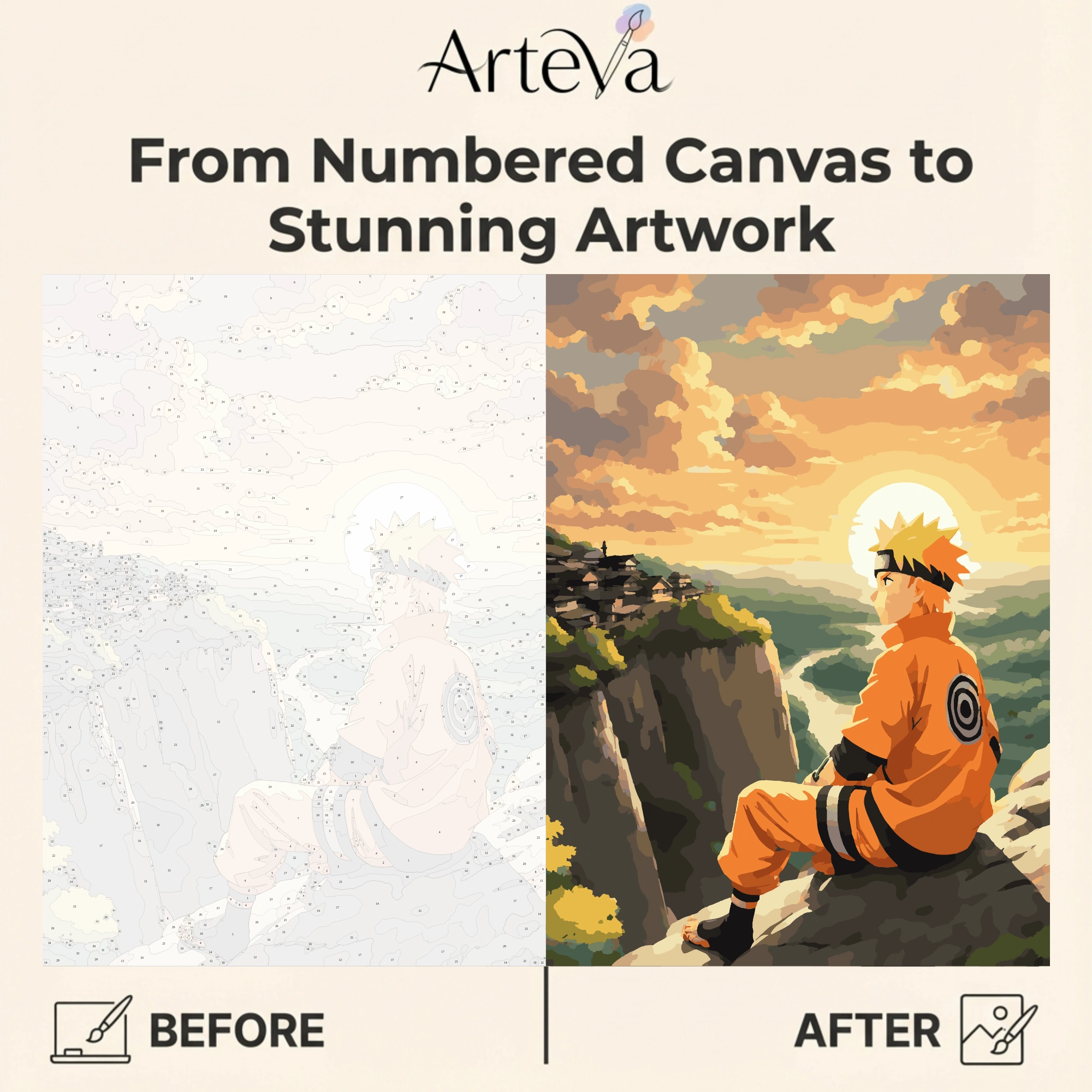 أفق المحارب هي لوحة تلوين بالأرقام بأسلوب أنمي هادئ تلتقط لحظة صمت وتأمل عند الغروب. يجلس المحارب على حافة جرف صخري وهو يراقب الشمس وهي تميل نحو الأفق، بينما تمتد أمامه الوديان الخضراء والضباب الخفيف، وتظهر قرية بعيدة فوق التلال كأنها حلم على أطراف السماء.