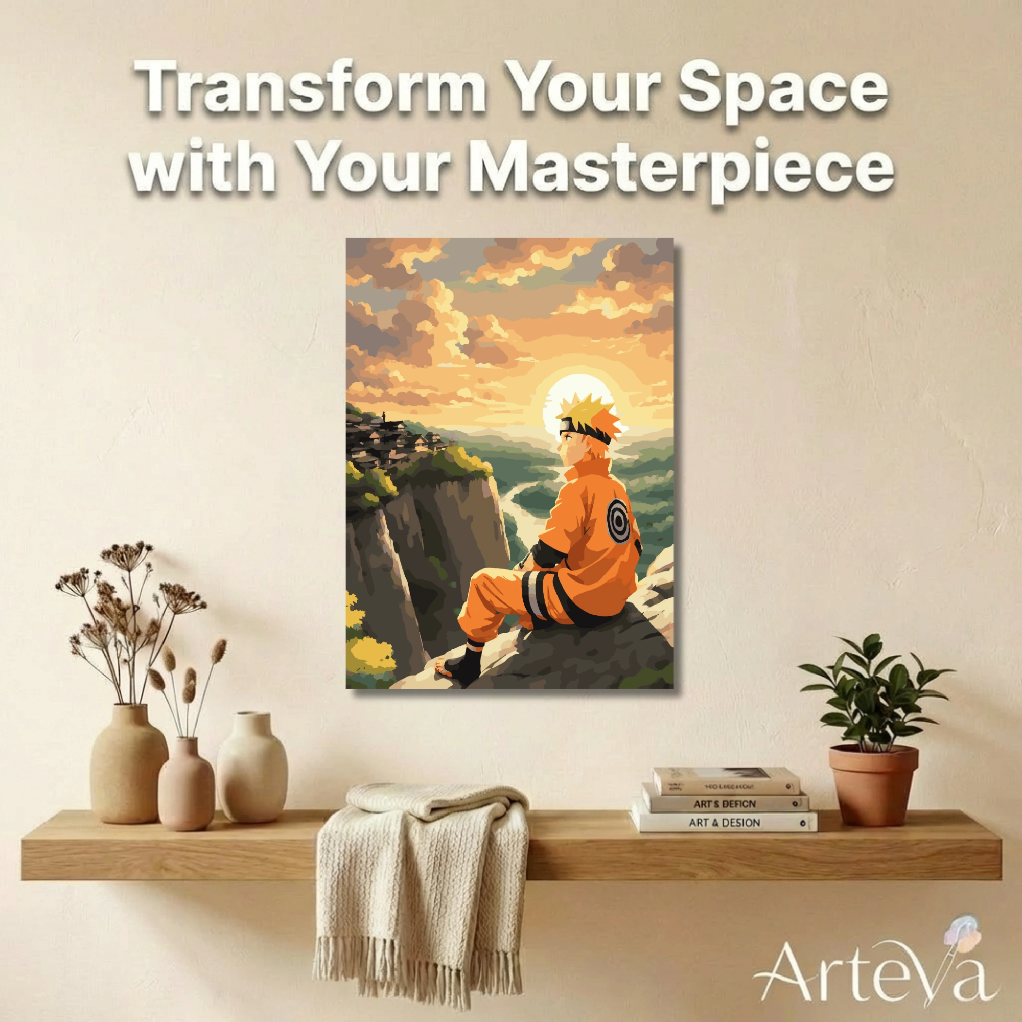 لوحة تلوين بالأرقام لمشهد أنمي تأملي لمحارب يجلس على جرف وقت الغروب أمام وادٍ وقرية بعيدة، ألوان ذهبية مريحة ونتيجة جدارية راقية.