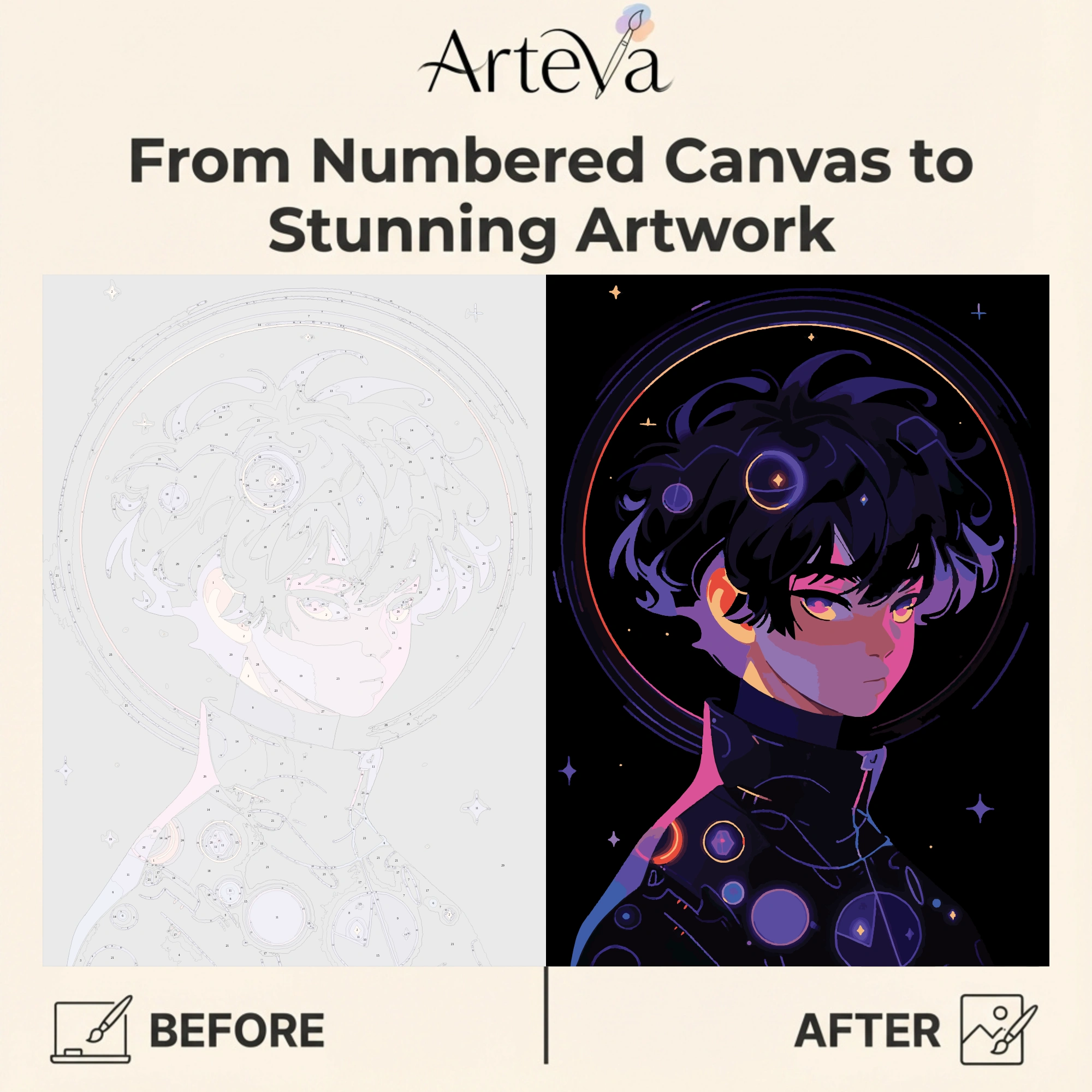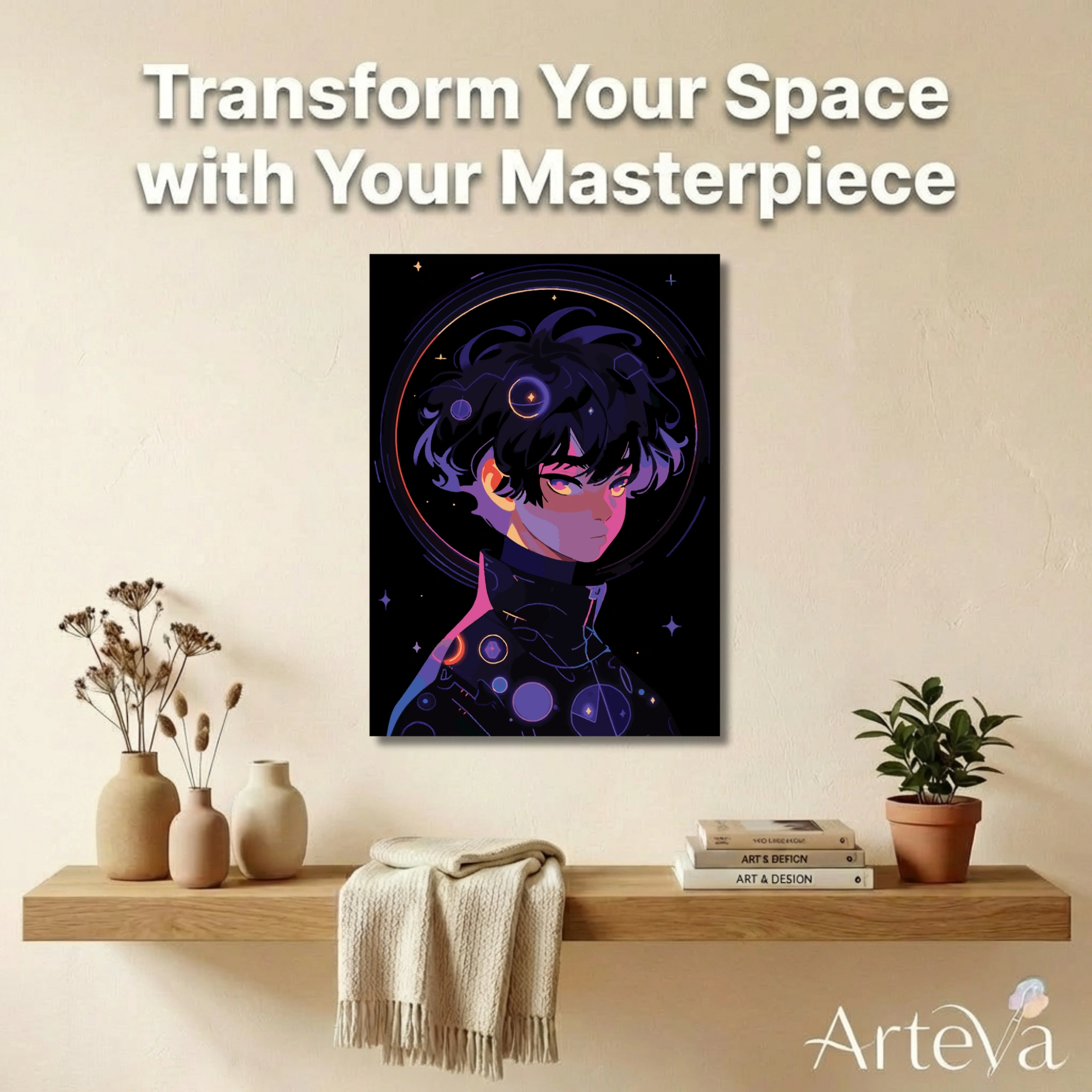 هالة نيون بنفسجية هي لوحة تلوين بالأرقام بطابع أنمي مستقبلي تُظهر شخصية بملامح هادئة ونظرة عميقة، محاطة بهالة دائرية تشبه مداراً كونيّاً تتناثر حوله نجوم صغيرة. الخلفية السوداء تمنح اللوحة قوة بصرية كبيرة، وتُبرز التوهج البنفسجي والوردي والبرتقالي كأنها إضاءة نيون داخل فضاء مظلم.