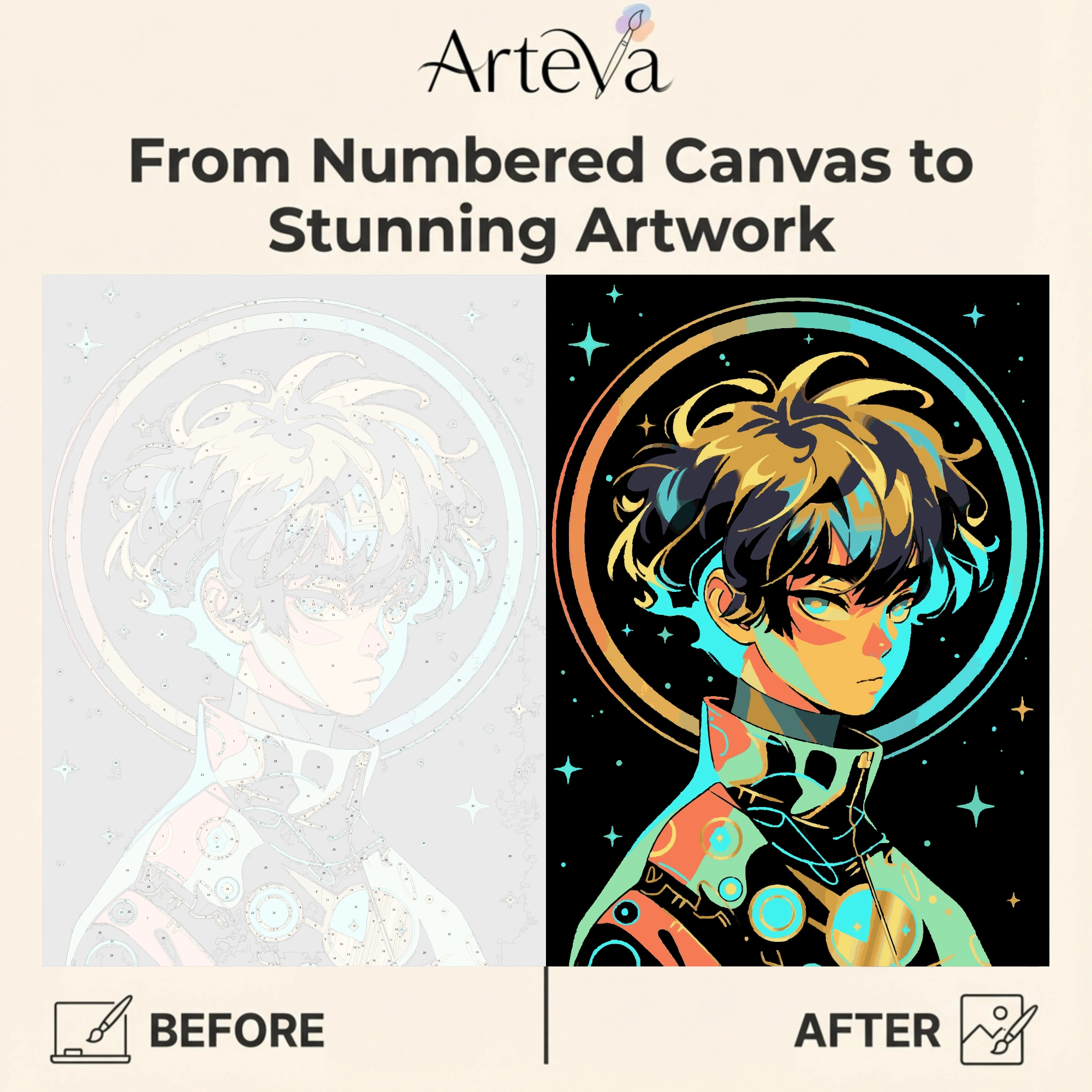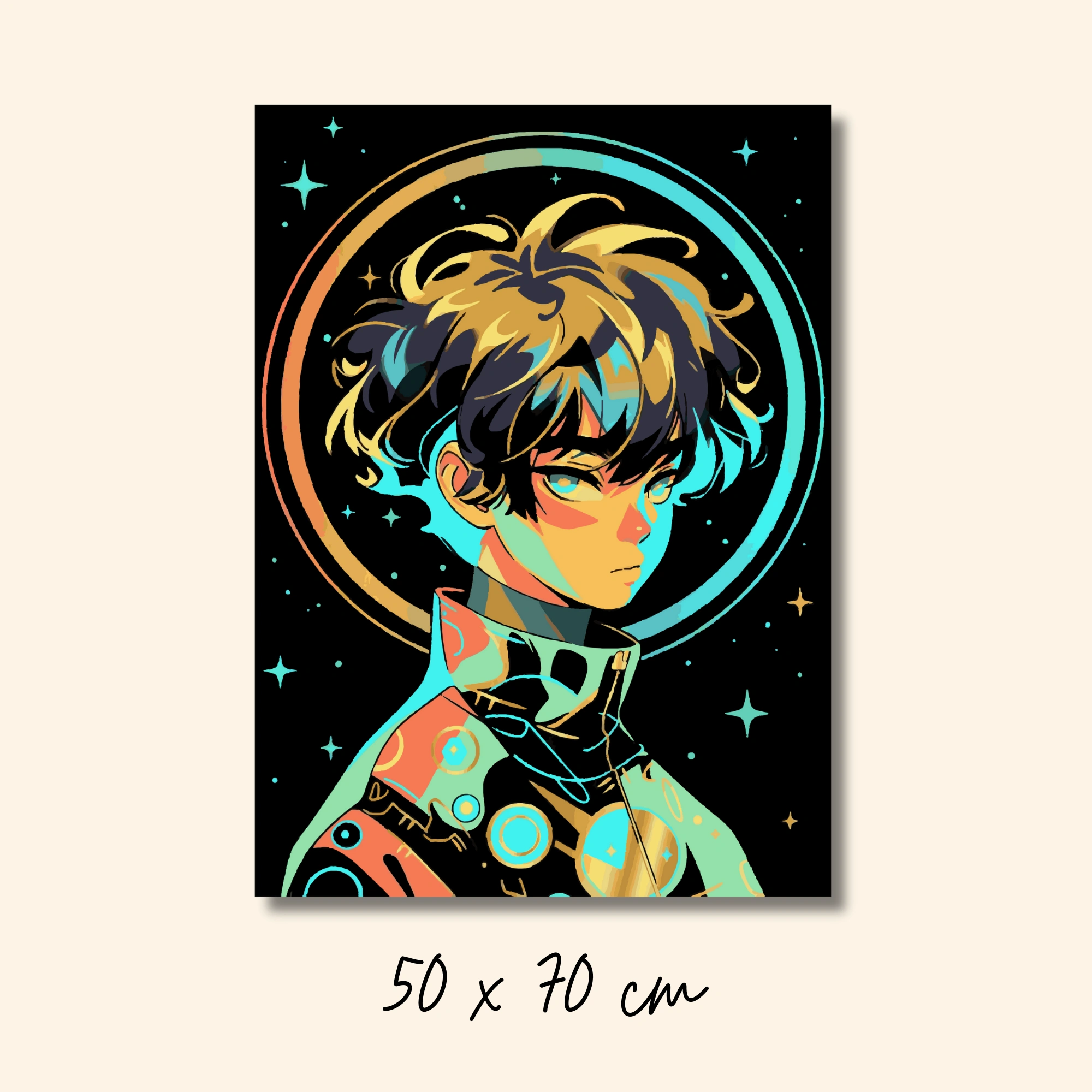 هالة نيون تركواز هي لوحة تلوين بالأرقام بطابع أنمي مستقبلي تجمع بين سحر الفضاء وأناقة النيون. تظهر الشخصية بملامح هادئة ونظرة ثابتة، محاطة بحلقة ضوئية كبيرة كأنها مدار كوني، مع نجوم متناثرة تعطي إحساساً بالاتساع والخيال.