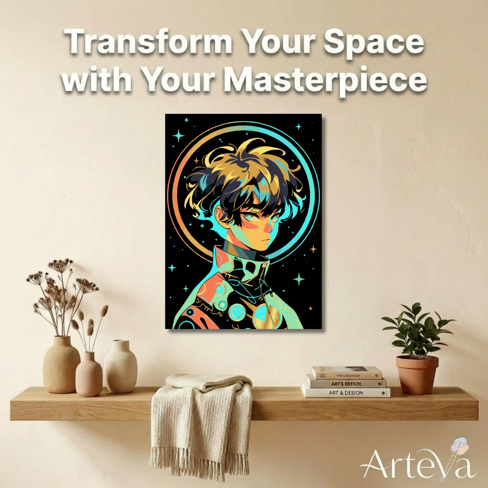 بعد الإكمال تتحول إلى بوستر أنمي عصري يليق بغرفة الألعاب، الاستوديو، أو أي مساحة تحب فيها لمسات النيون والخيال العلمي.