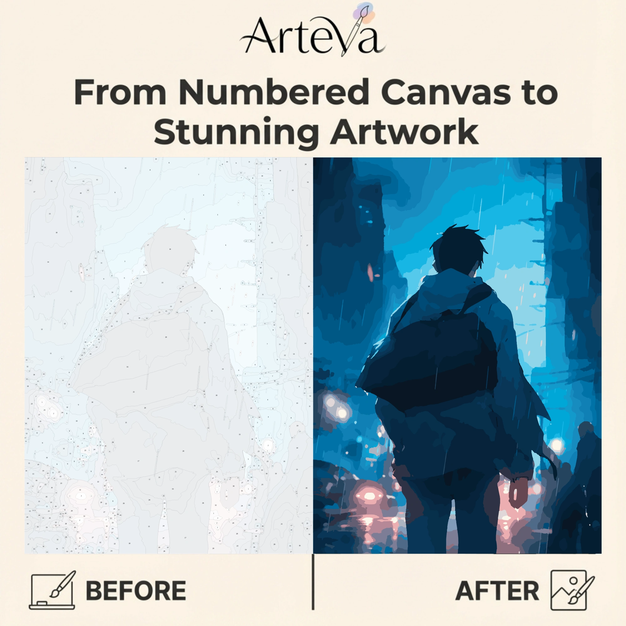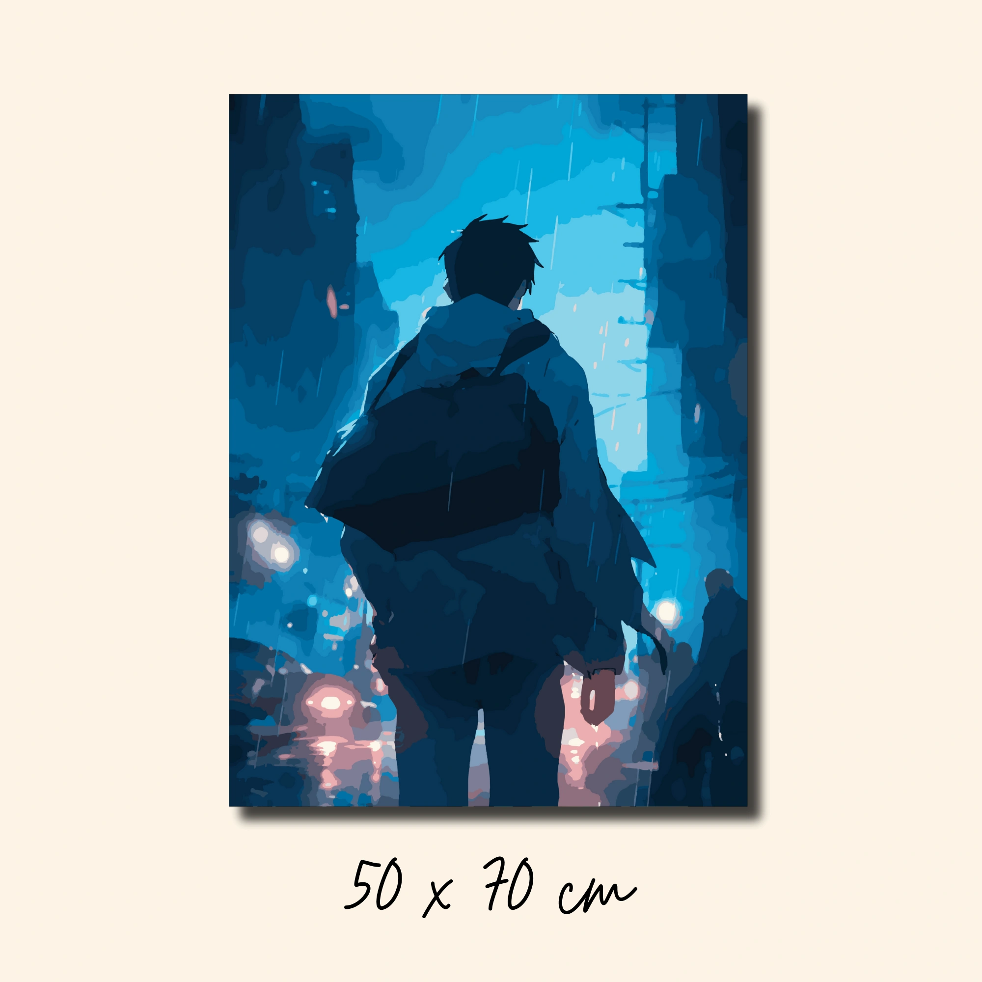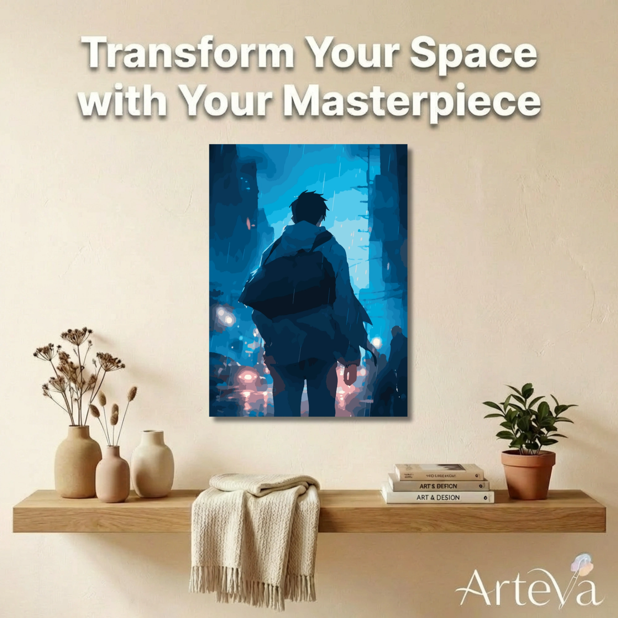 لوحة تلوين بالأرقام لمشهد أنمي حضري لشخص يسير في شارع ممطر بإضاءة زرقاء وانعكاسات ليلية، أجواء سينمائية هادئة ونتيجة ديكور عصرية.