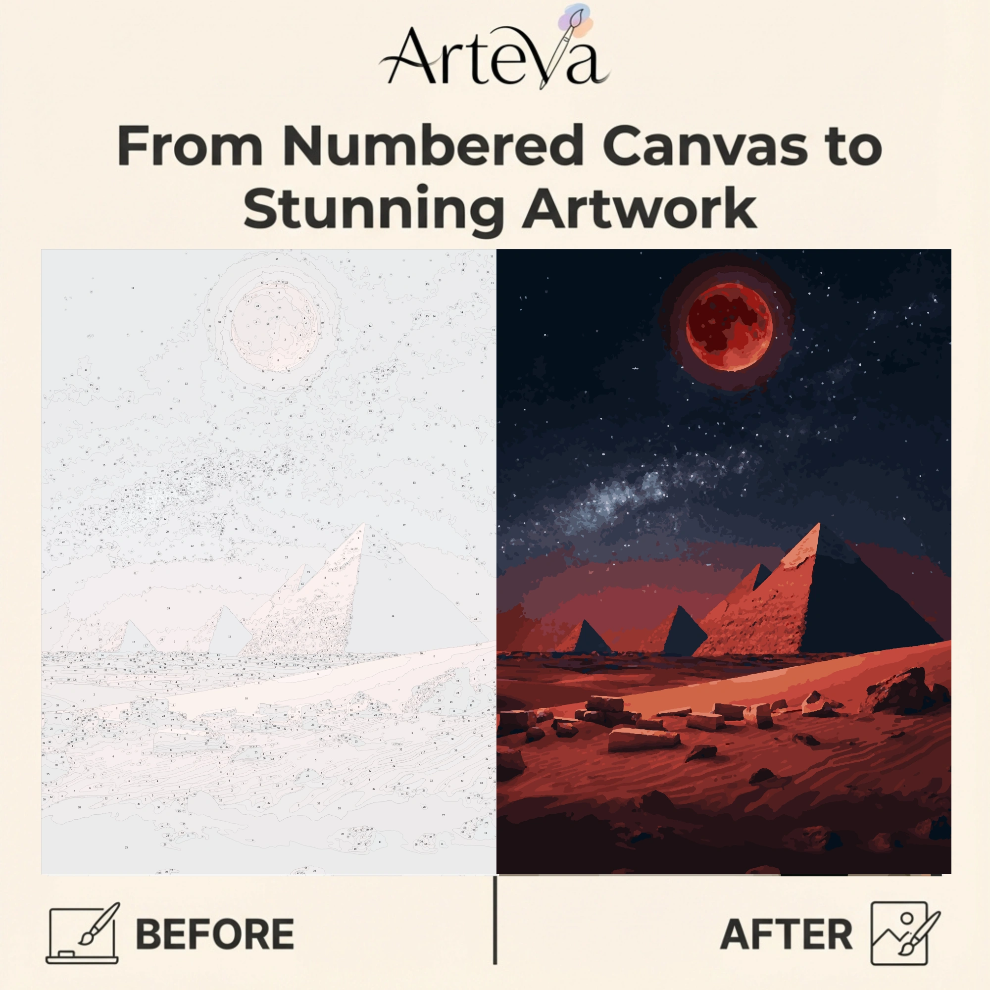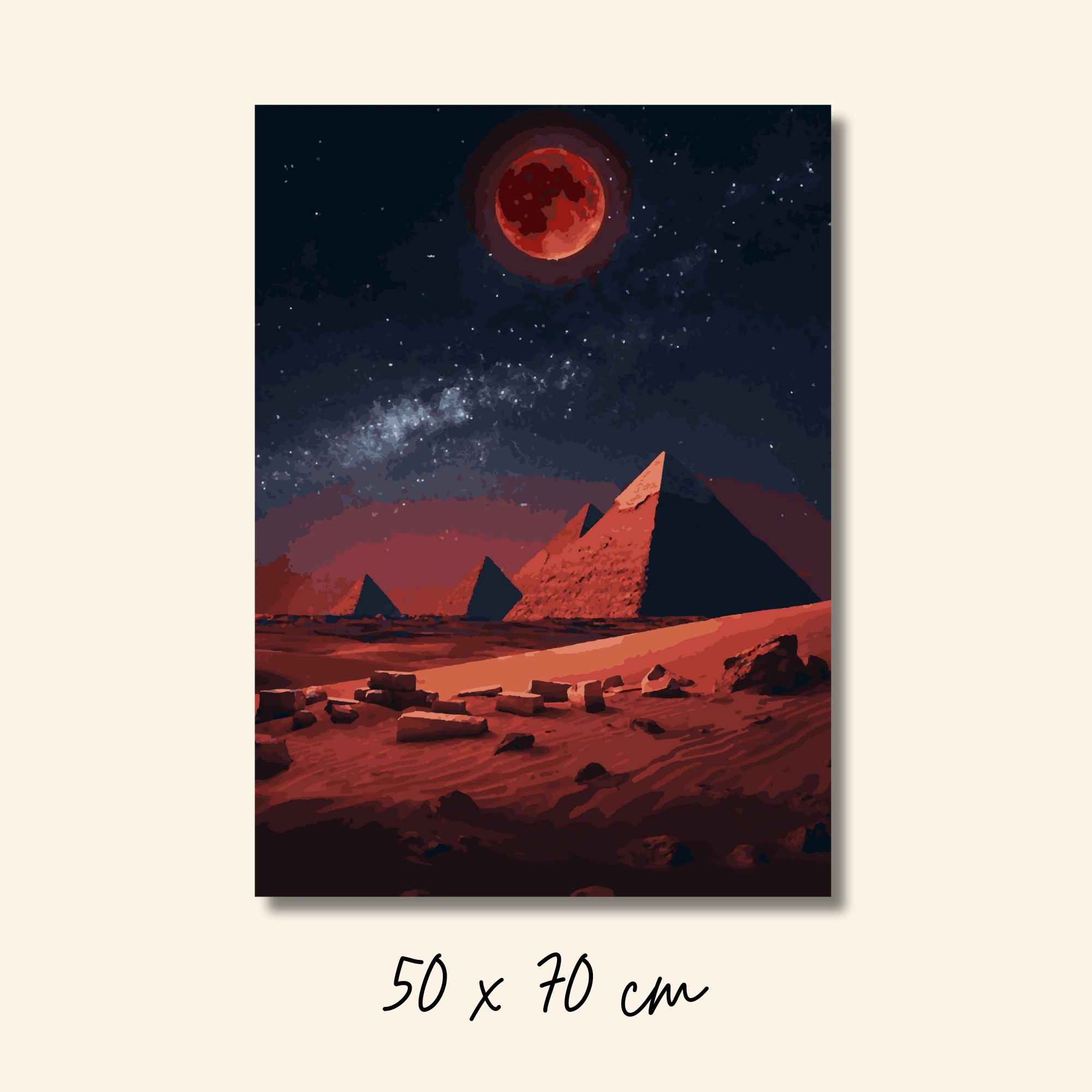 القمر الدموي هي لوحة تلوين بالأرقام تأسر المشاهد بمنظر كوني نادر وساحر، حيث تقف الأهرامات الثلاثة الشامخة كحراس صامتين تحت وهج قمر الدم الأحمر العملاق المحاط بهالة متوهجة تخترق ظلمة الليل. هذا التصميم الاستثنائي يجمع بين دقة التوثيق التاريخي للأهرامات وجمال الظواهر الكونية النادرة في تحفة فنية تمزج بين العلم والتراث والخيال.