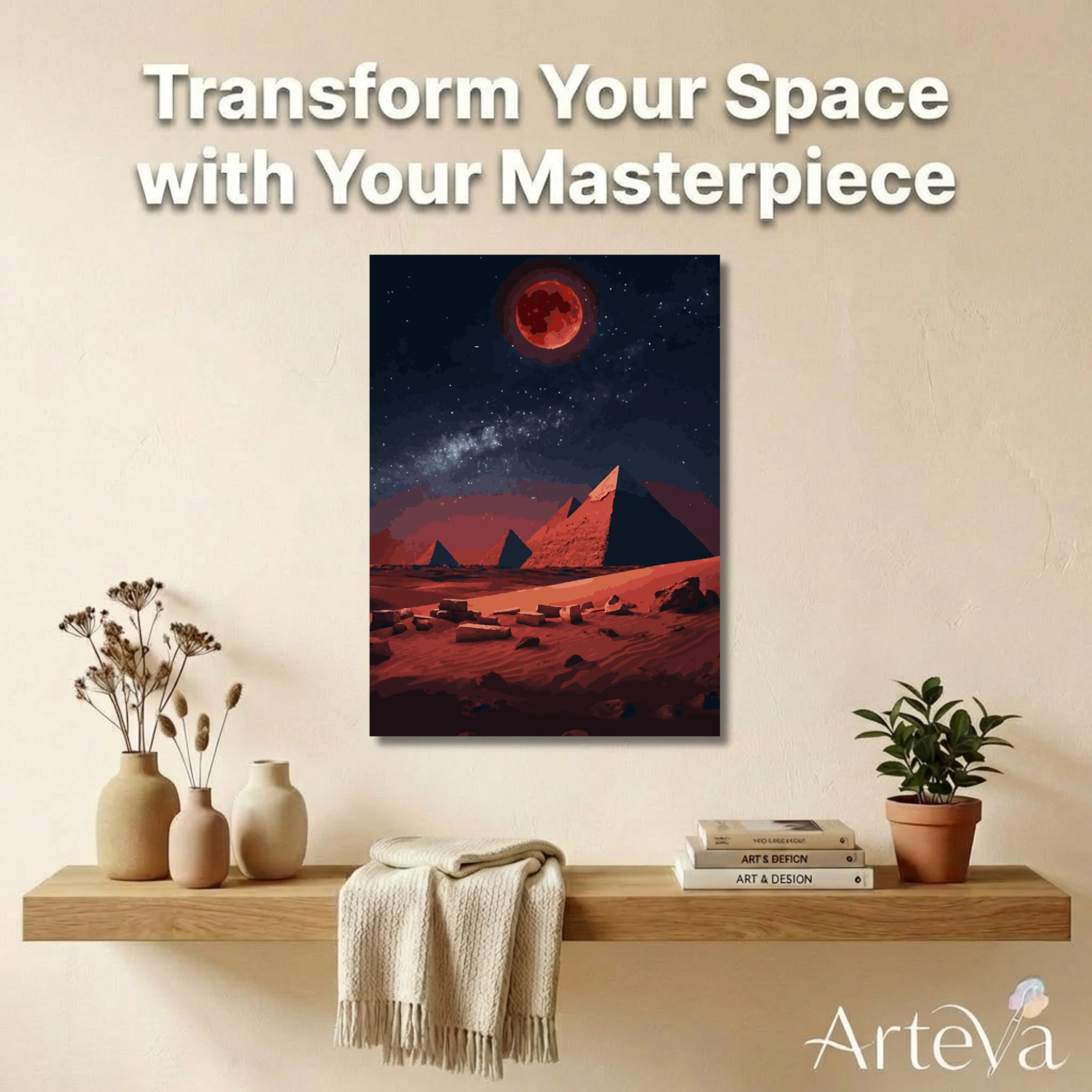 لا تفوت فرصة امتلاك هذه التحفة الفنية الدرامية التي تجمع بين عظمة التاريخ المصري وسحر الظواهر الكونية النادرة. اطلب طقم "القمر الدموي فوق الأهرامات" اليوم واستمتع بتجربة فنية تأخذك في رحلة عبر الزمن والفضاء، لتنتج عملاً مذهلاً يملأ منزلك بالغموض والجمال والسحر الكوني.