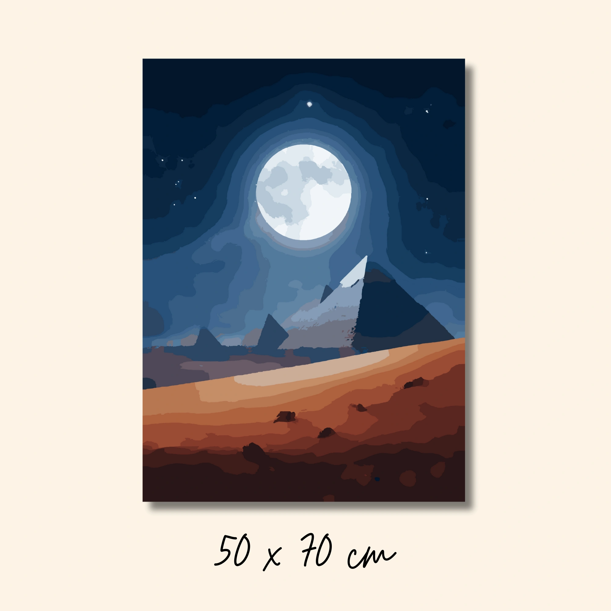 لوحة تلوين بالأرقام للأهرامات المصرية تحت قمر مكتمل ساطع وسماء ليلية مرصعة بالنجوم، تجمع بين سحر الليل الأزرق ودفء الرمال الذهبية في قطعة فنية هادئة.