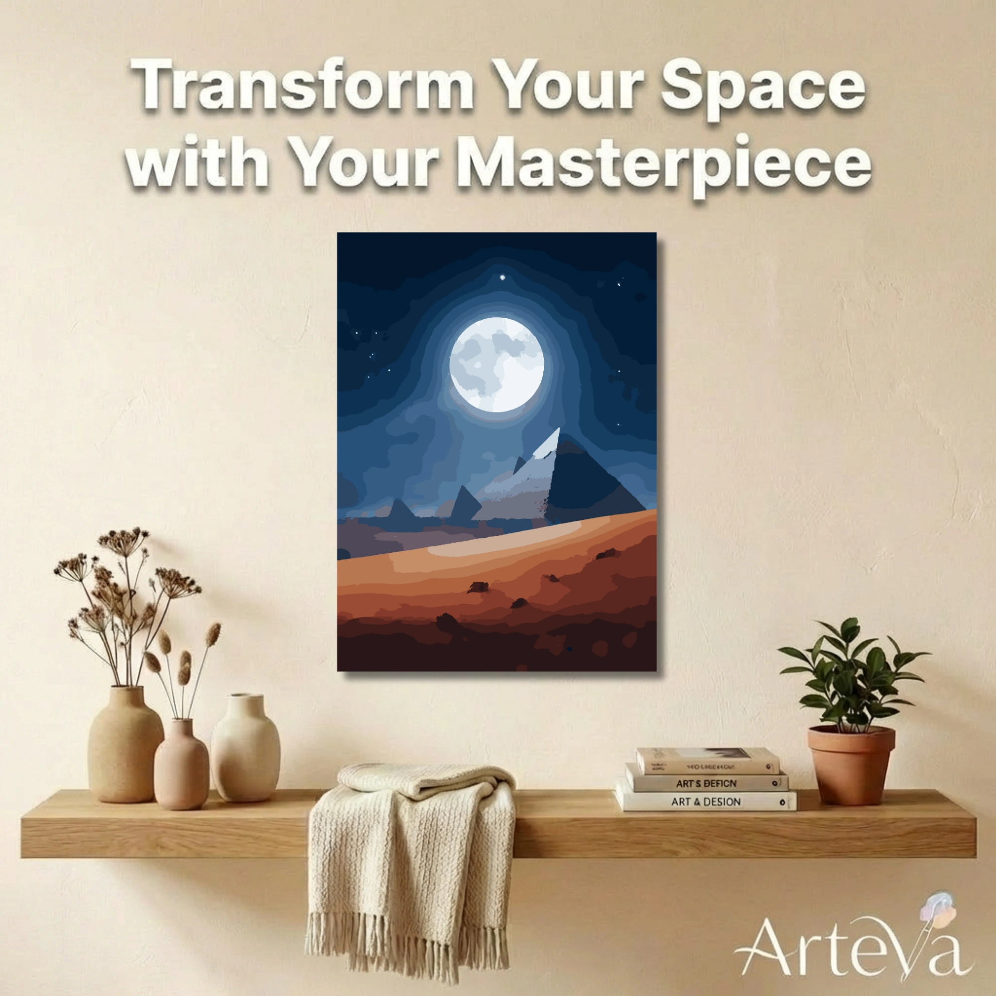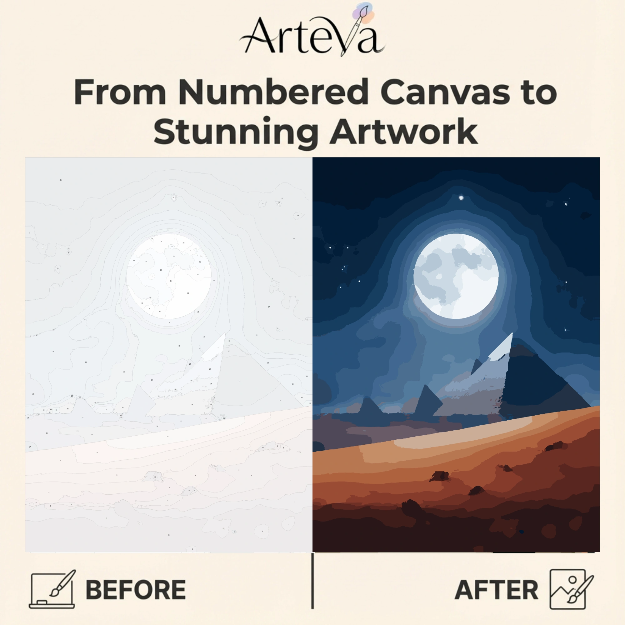 ذاكرة القمر لوحة تلوين بالأرقام تجسد الأهرامات المصرية تحت قمر مكتمل ساطع وسماء ليلية مرصعة بالنجوم. التباين الرائع بين الأزرق البارد والرمال الذهبية الدافئة يخلق تجربة تلوين هادئة ومريحة للأعصاب. التدرجات اللونية المدروسة تساعد على الاسترخاء والتركيز الذهني. بعد الانتهاء تتحول إلى قطعة ديكور أنيقة تناسب غرفة المعيشة أو المكتب، وتعبر عن جمال مصر وعظمة حضارتها الخالدة. مثالية لجميع الأعمار ومستويات الخبرة الفنية.