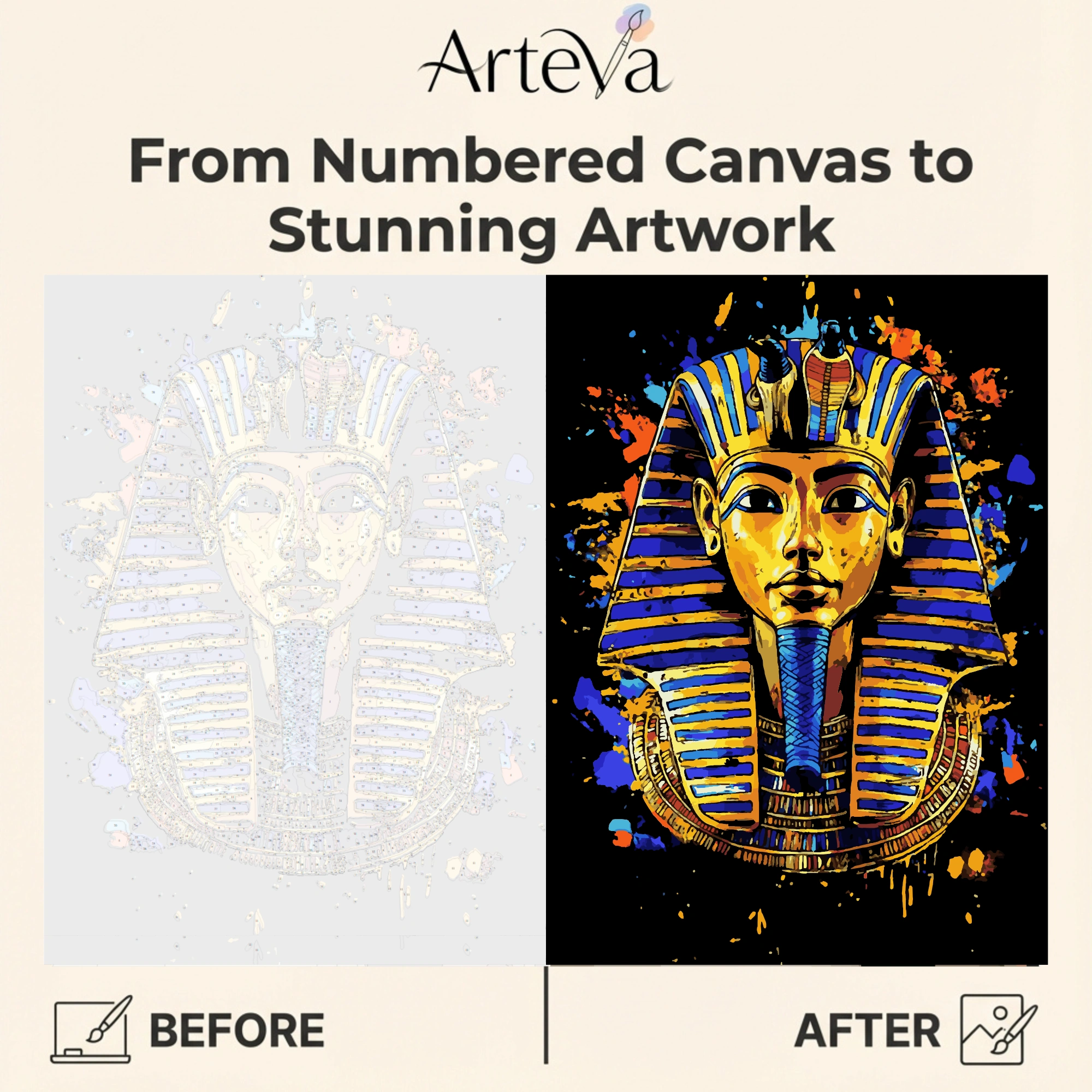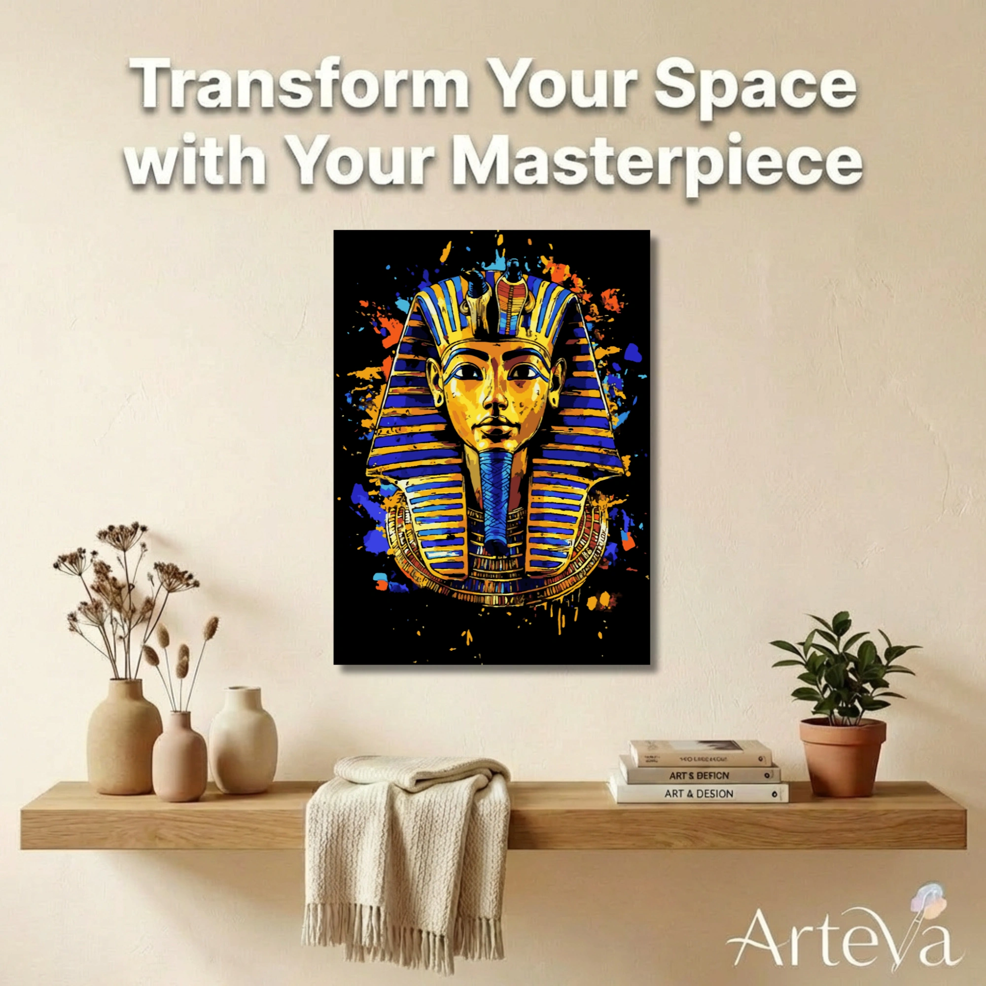 لوحة تلوين بالأرقام لقناع الملك توت عنخ آمون الذهبي بأسلوب البوب آرت العصري مع رشات ألوان حيوية على خلفية سوداء، تجمع بين عراقة التاريخ المصري.