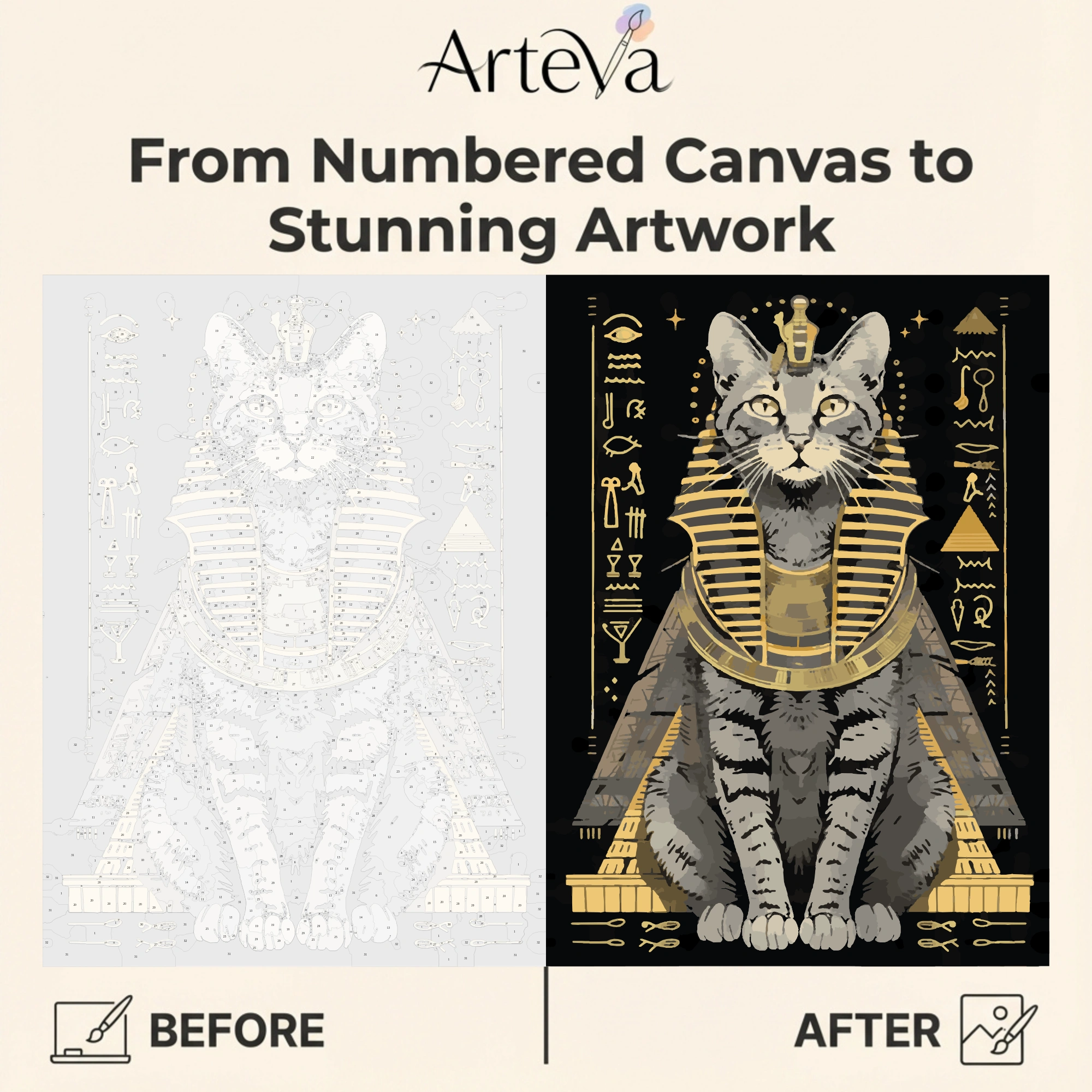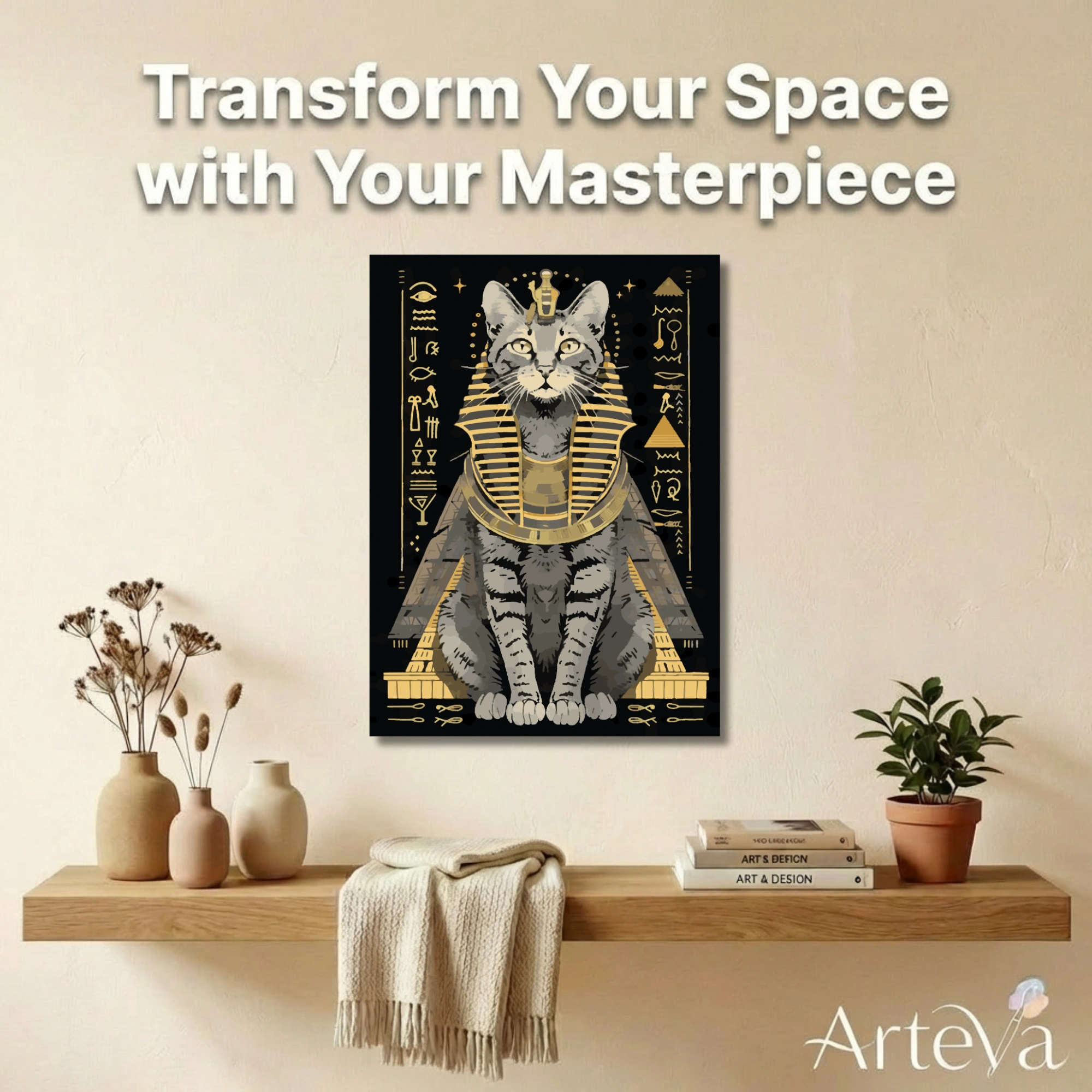 لوحة تلوين بالأرقام لقط رمادي ملكي يرتدي تاج النمس الذهبي وقلادة فرعونية مقدسة على عرش ذهبي، محاط بالهيروغليفية المقدسة على خلفية سوداء عميقة.