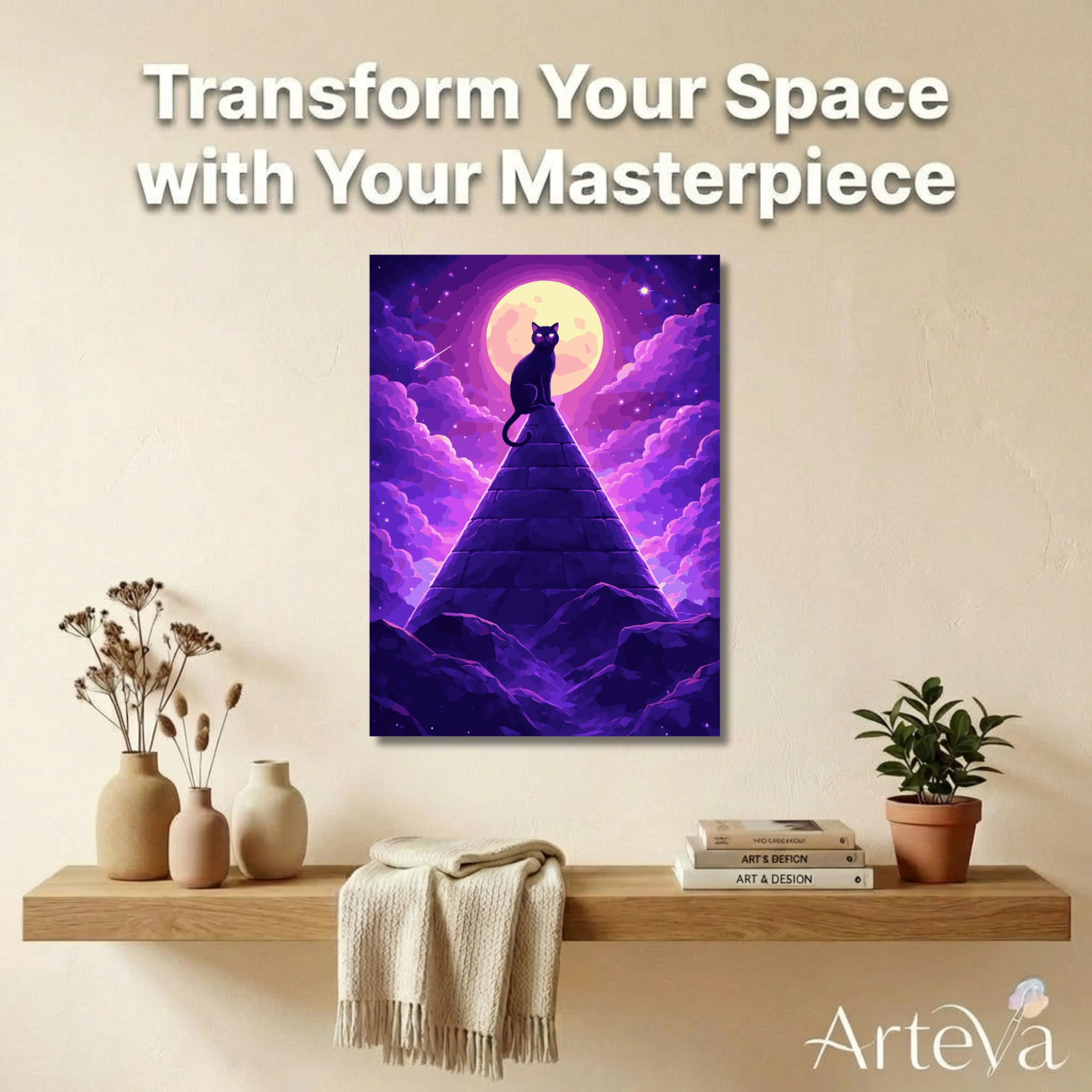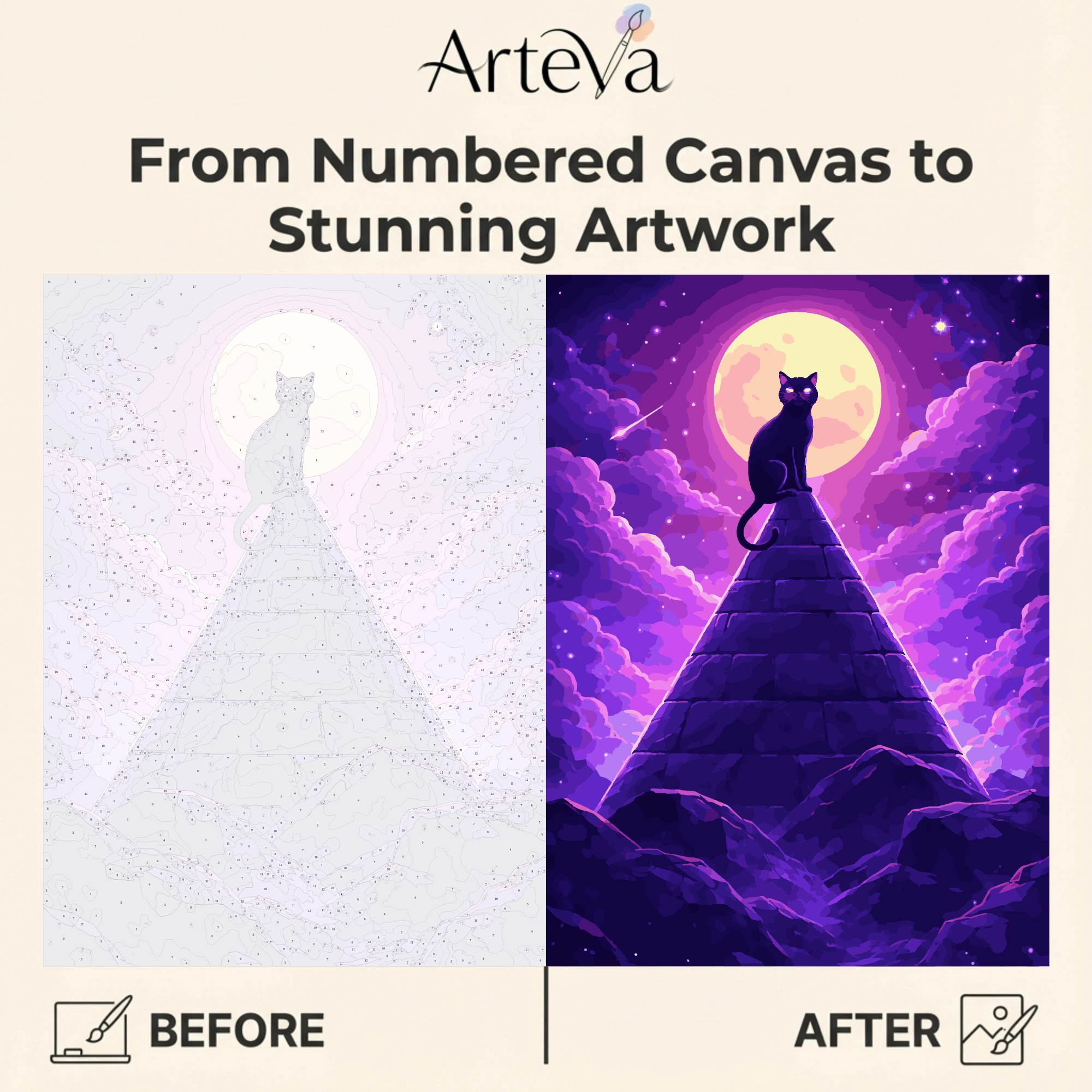 لوحة تلوين بالأرقام لقط أسود غامض يجلس على قمة هرم تحت قمر عملاق ساطع بألوان بنفسجية وردية سحرية، تجسد سحر الليل المصري وغموض الأساطير الفرعونية.