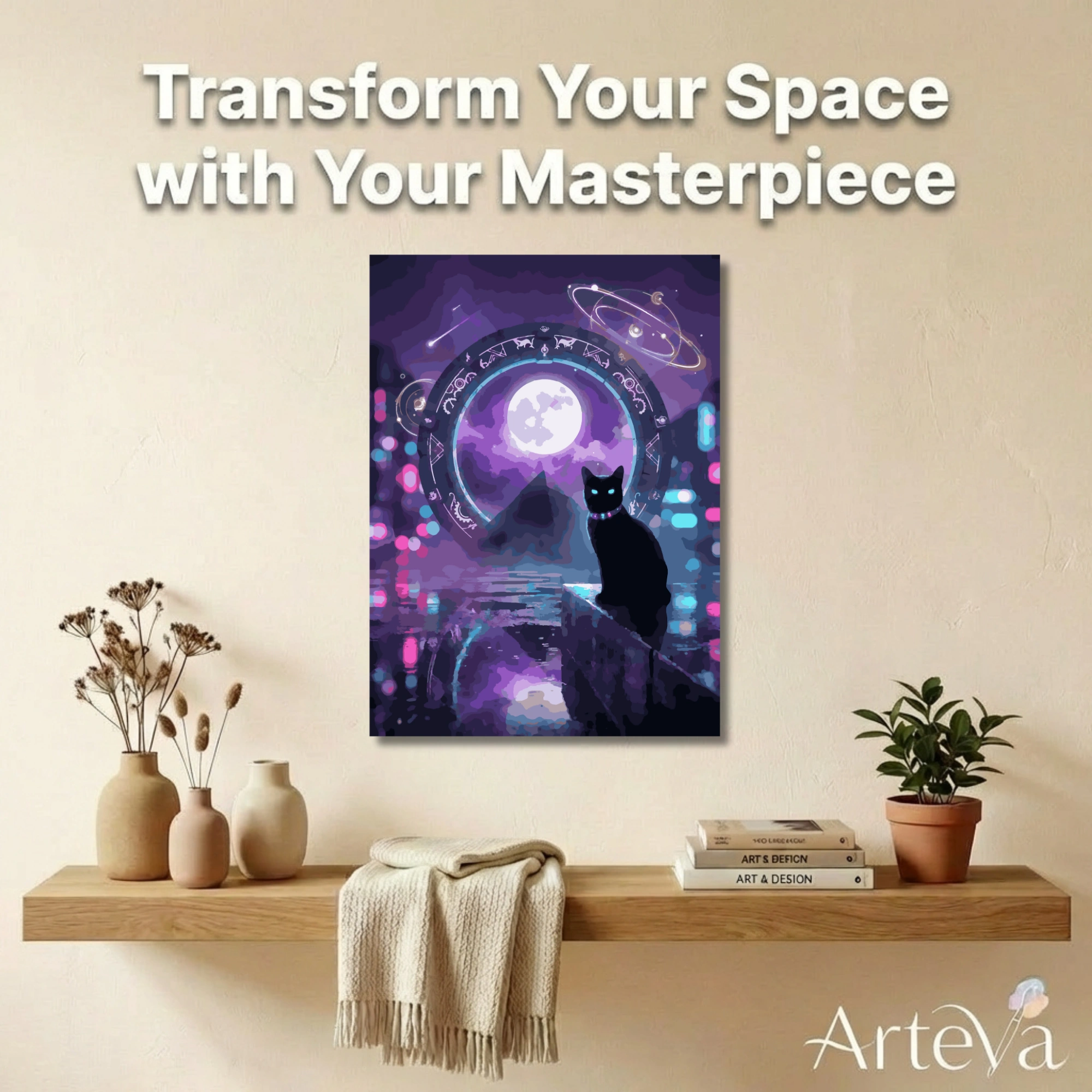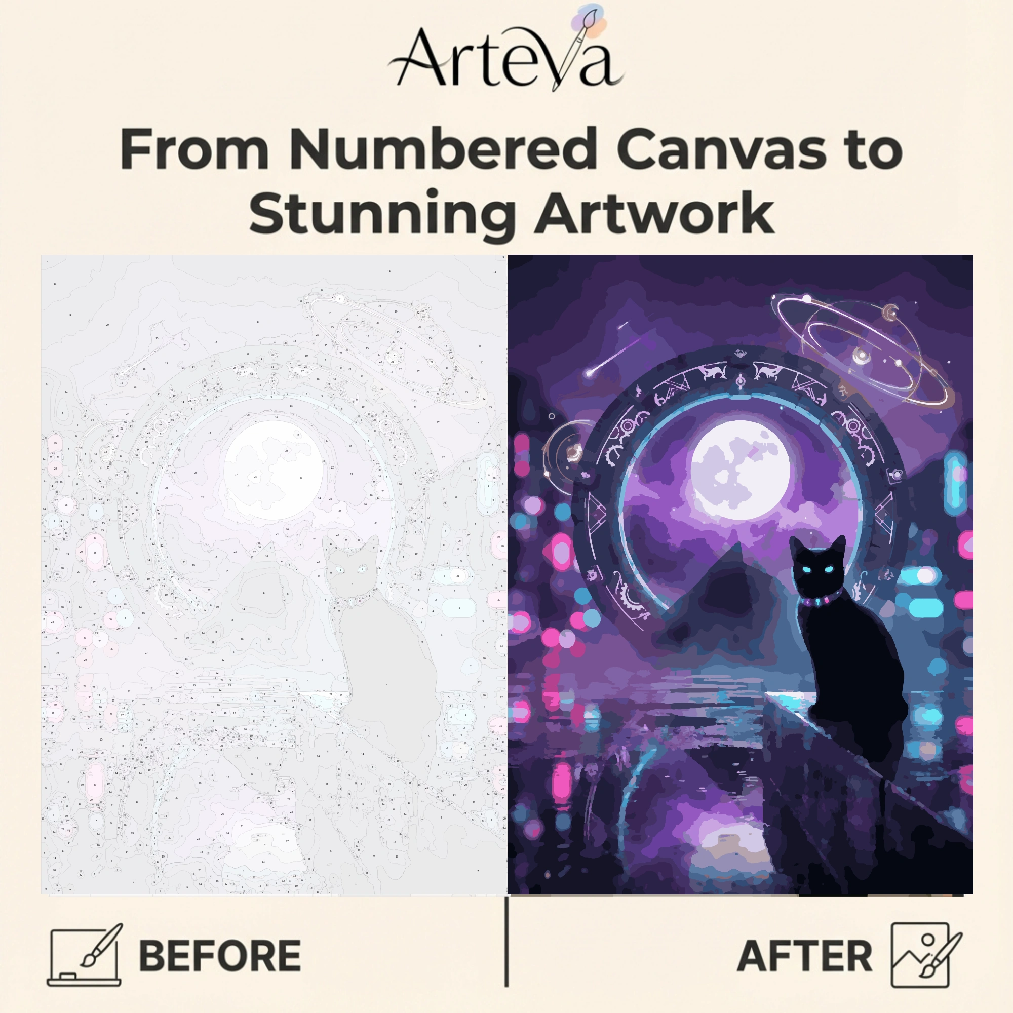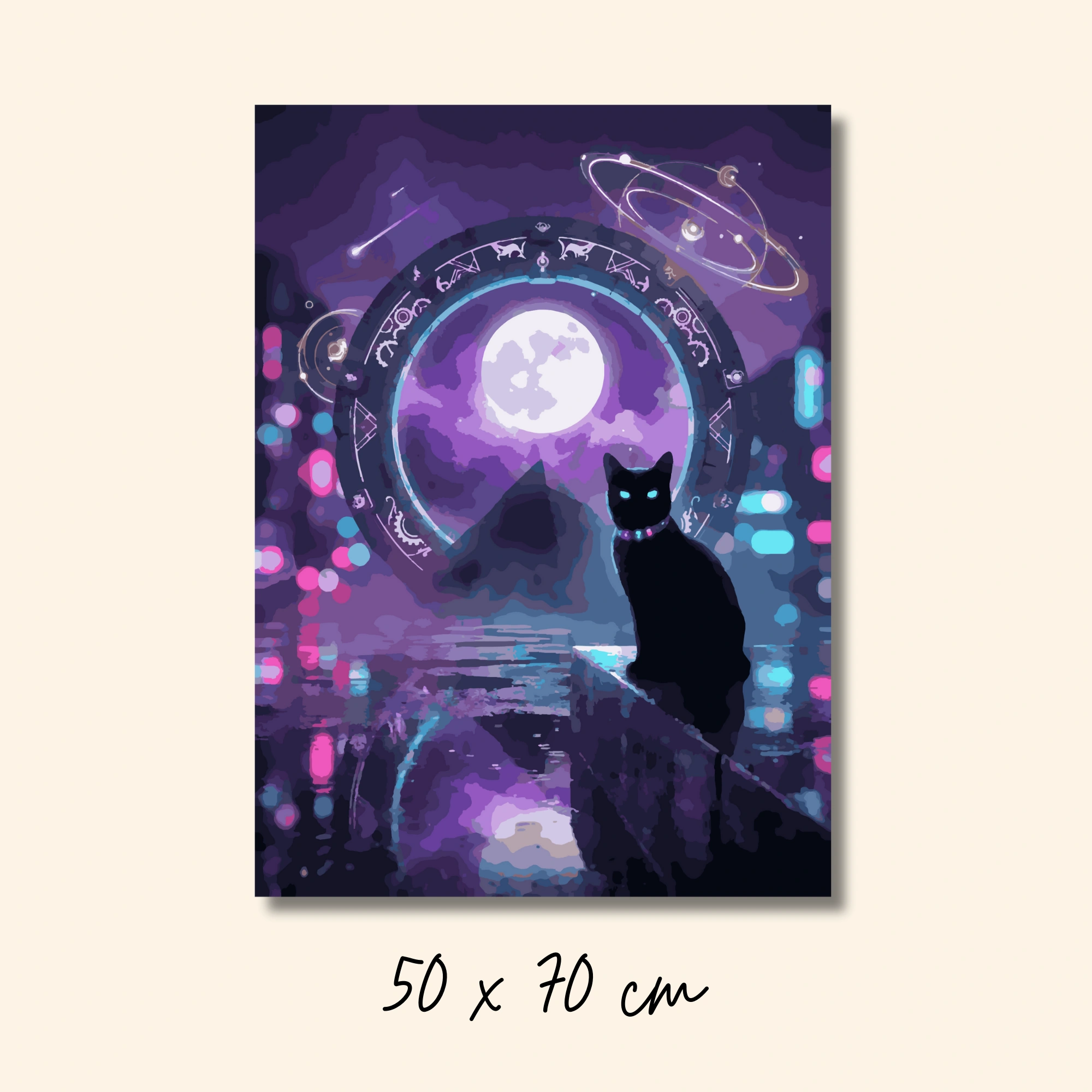 حارس البوابة الكونية لوحة تلوين بالأرقام بأسلوب سايبربانك تصور قطاً أسود بعيون فيروزية متوهجة أمام بوابة زمنية مزينة برموز الأبراج الفلكية تطل على هرم وقمر بنفسجي. كواكب هولوغرافية دوارة وألوان نيون نابضة من البنفسجي للوردي والأزرق تنعكس على سطح مائي لامع. قلادة سحرية متوهجة وأضواء بوكيه ملونة تضيف سحراً كونياً. تجربة تلوين خيالية تحفز الإبداع والهروب للمستقبل. تتحول لديكور عصري جريء يناسب غرف الألعاب. مثالية للشباب وعشاق الخيال العلمي والفن الرقمي المبتكر.