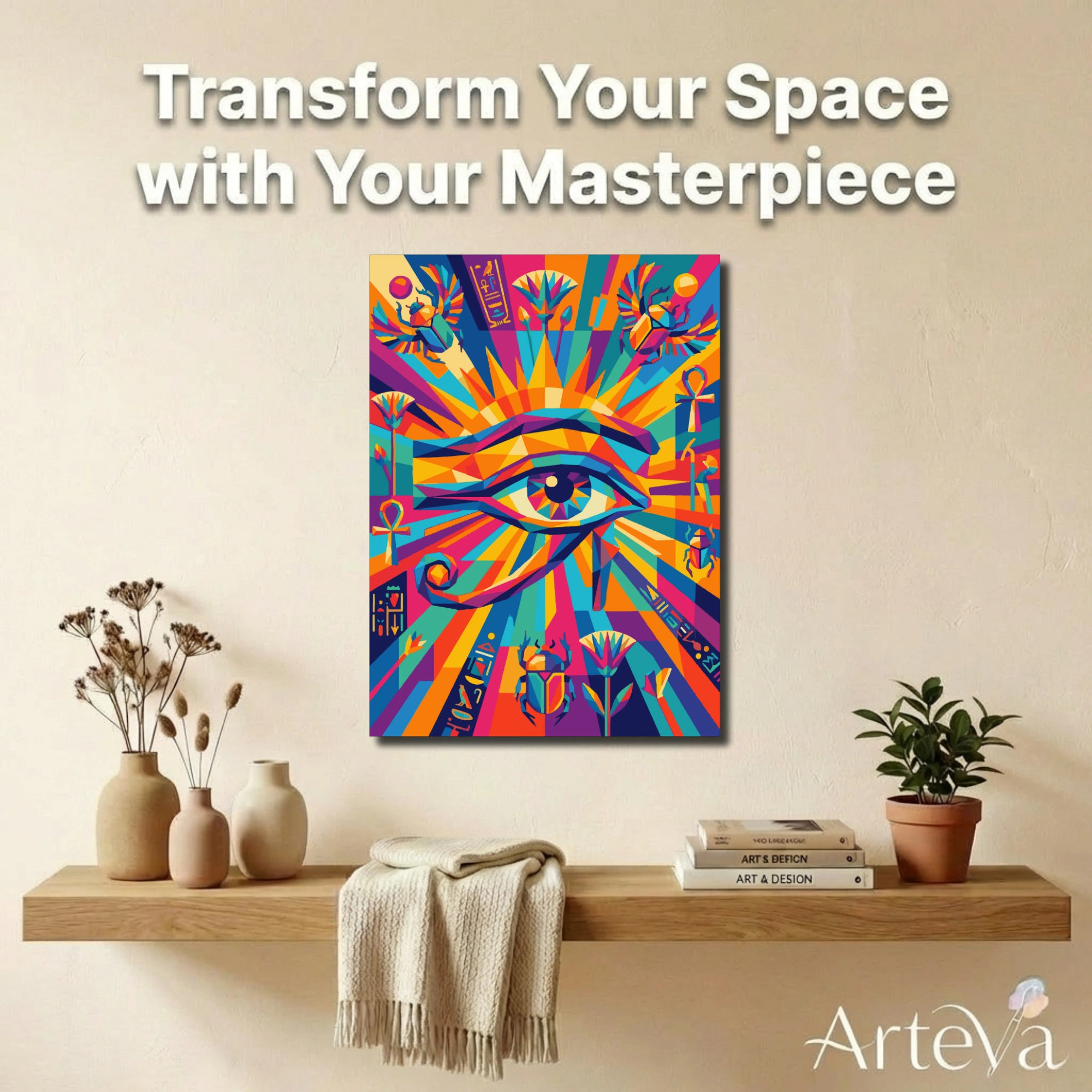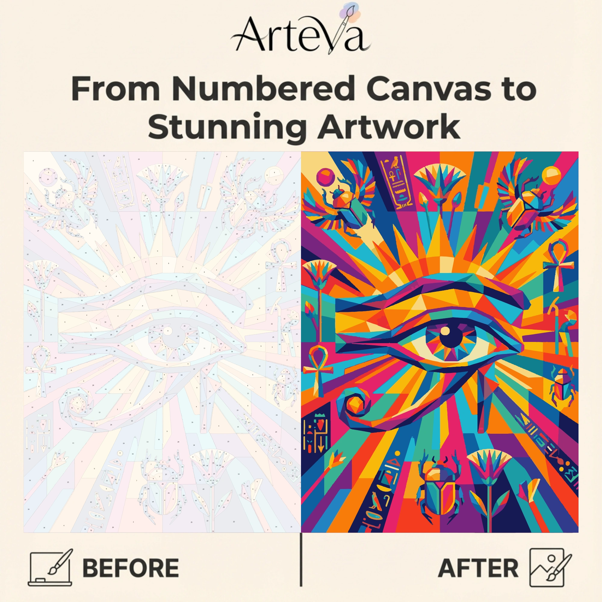 عين حورس الكونية لوحة تلوين بالأرقام بوب آرت انفجارية لعين حورس المقدسة بمساحات هندسية ملونة بأسلوب فسيفساء حديث. أشعة شمس متفجرة بألوان قوس قزح من البرتقالي والفوشيا والفيروزي والأصفر والبنفسجي تنطلق من العين. رموز مصرية كالجعران واللوتس والأنخ بألوان نيون نابضة. خلفية هندسية متقاطعة تخلق حركة وطاقة. تباين قوي بين ألوان دافئة وباردة. تجربة تلوين مبهجة محفزة تبث طاقة إيجابية فورية. تتحول لديكور استثنائي يشع حياة. مثالية لعشاق البوب آرت والرموز الروحية والطاقة الإيجابية والاحتفال بالحياة والتراث بطريقة ثورية.