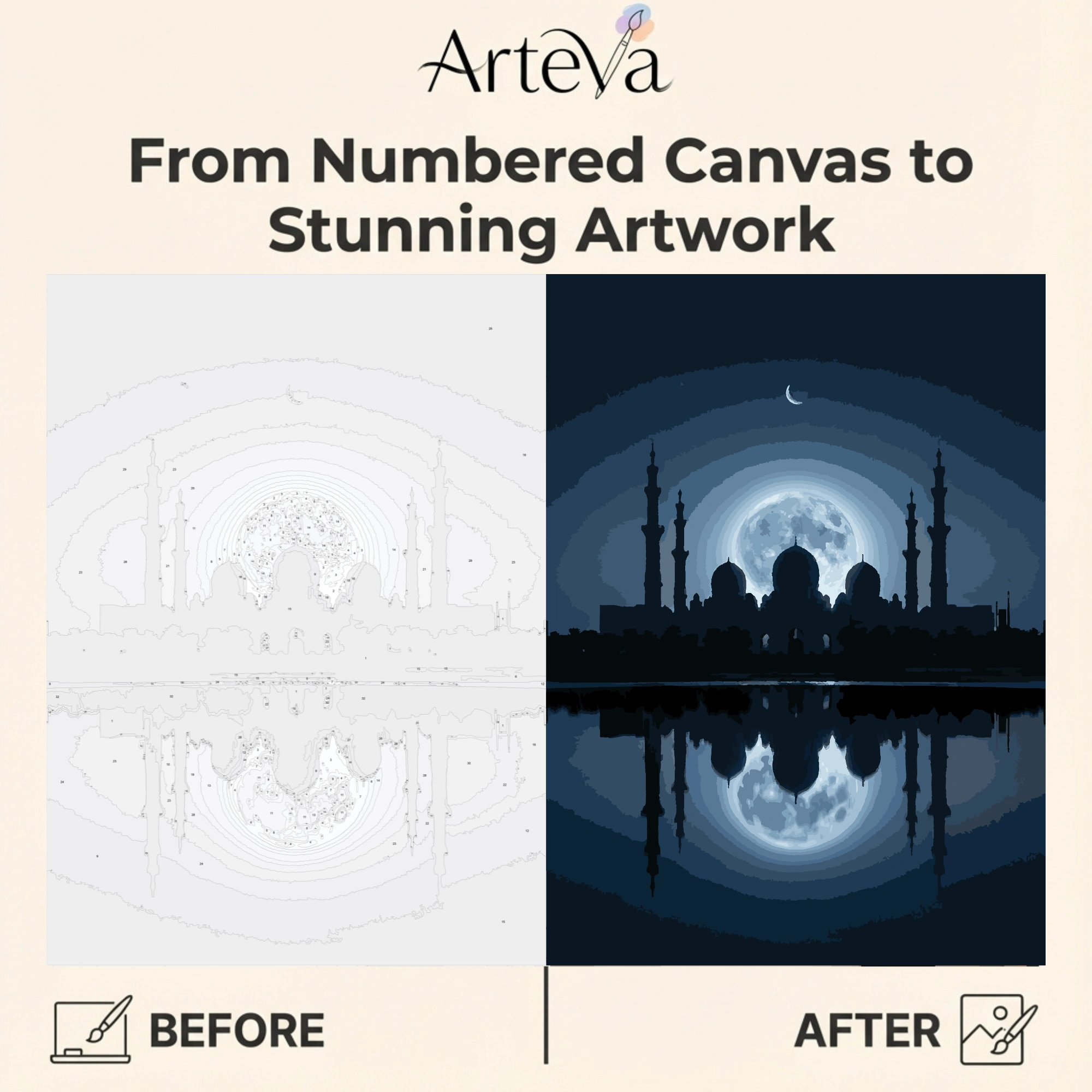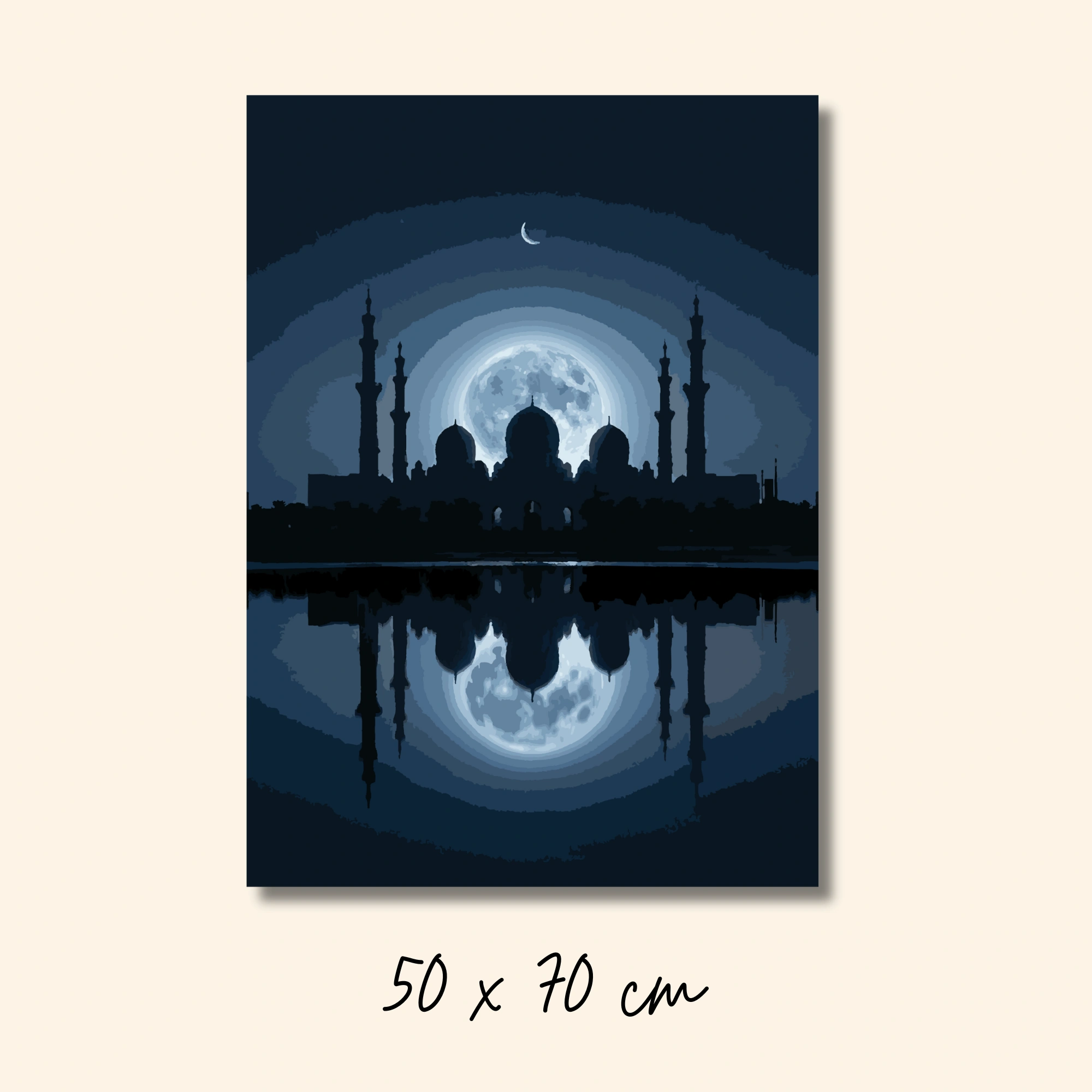 انعكاس القمر هي لوحة تلوين بالأرقام تقدم مشهداً شاعرياً لمسجد مهيب بقبابه ومآذنه ينعكس على مياه هادئة تحت قمر مكتمل مضيء. التناظر المثالي بين المسجد وانعكاسه يخلق تناغماً بصرياً مريحاً للعين.