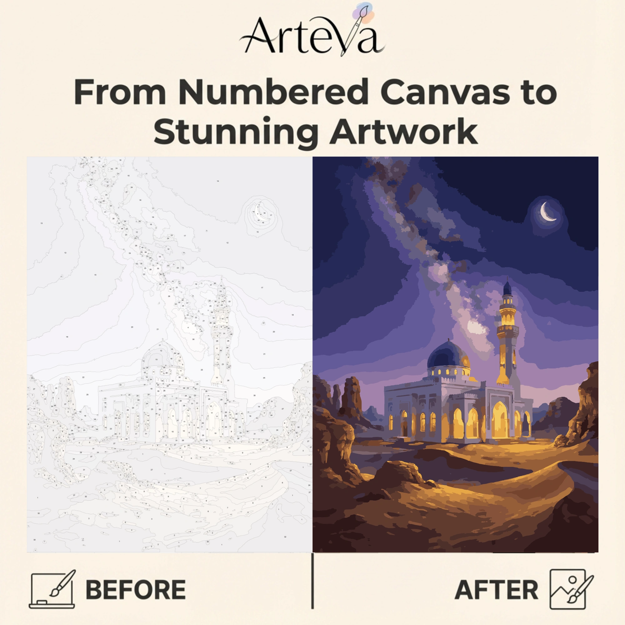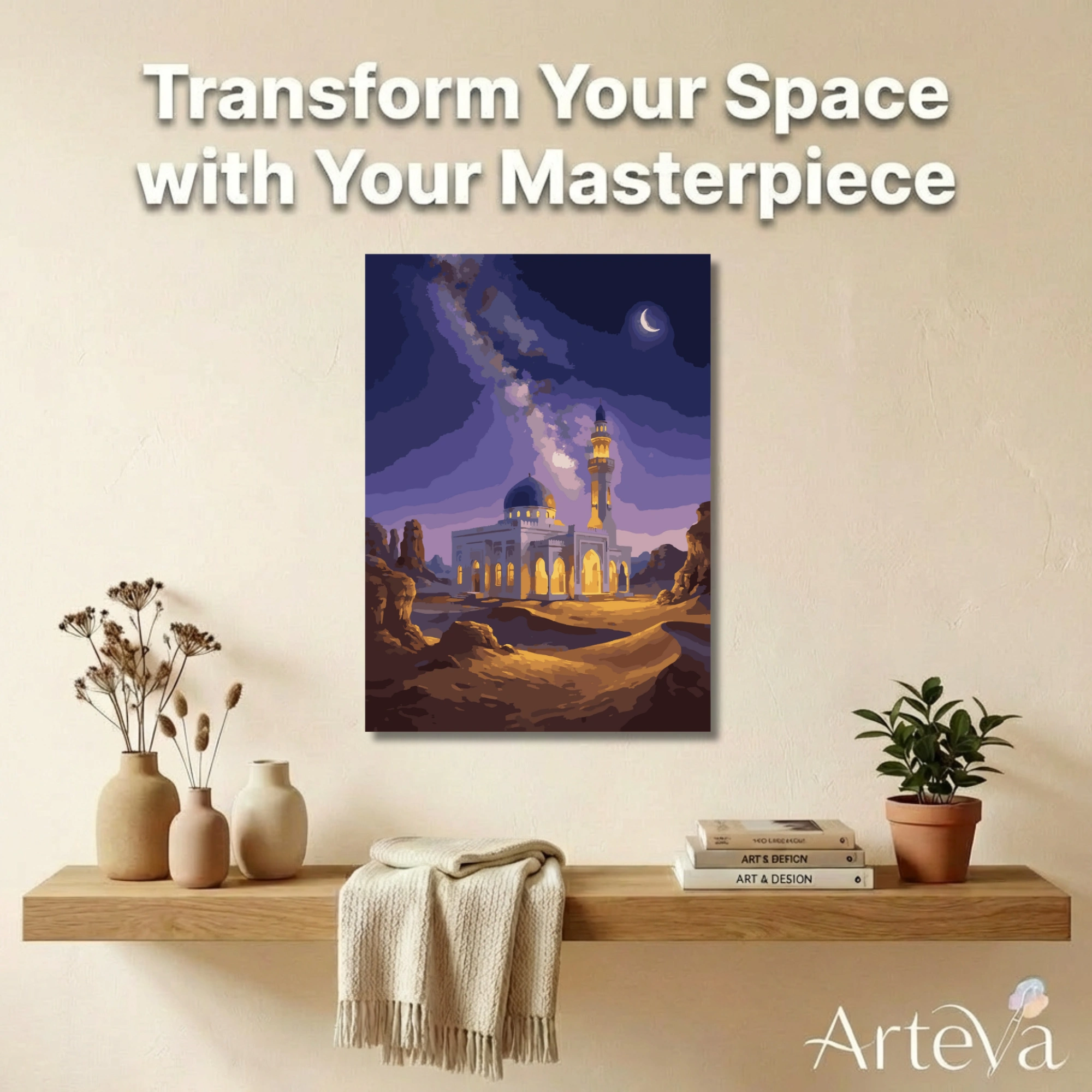 لوحة تلوين بالأرقام لمسجد مضيء في الصحراء تحت مجرة درب التبانة، تجربة فنية حالمة تجمع بين الطبيعة والعمارة.