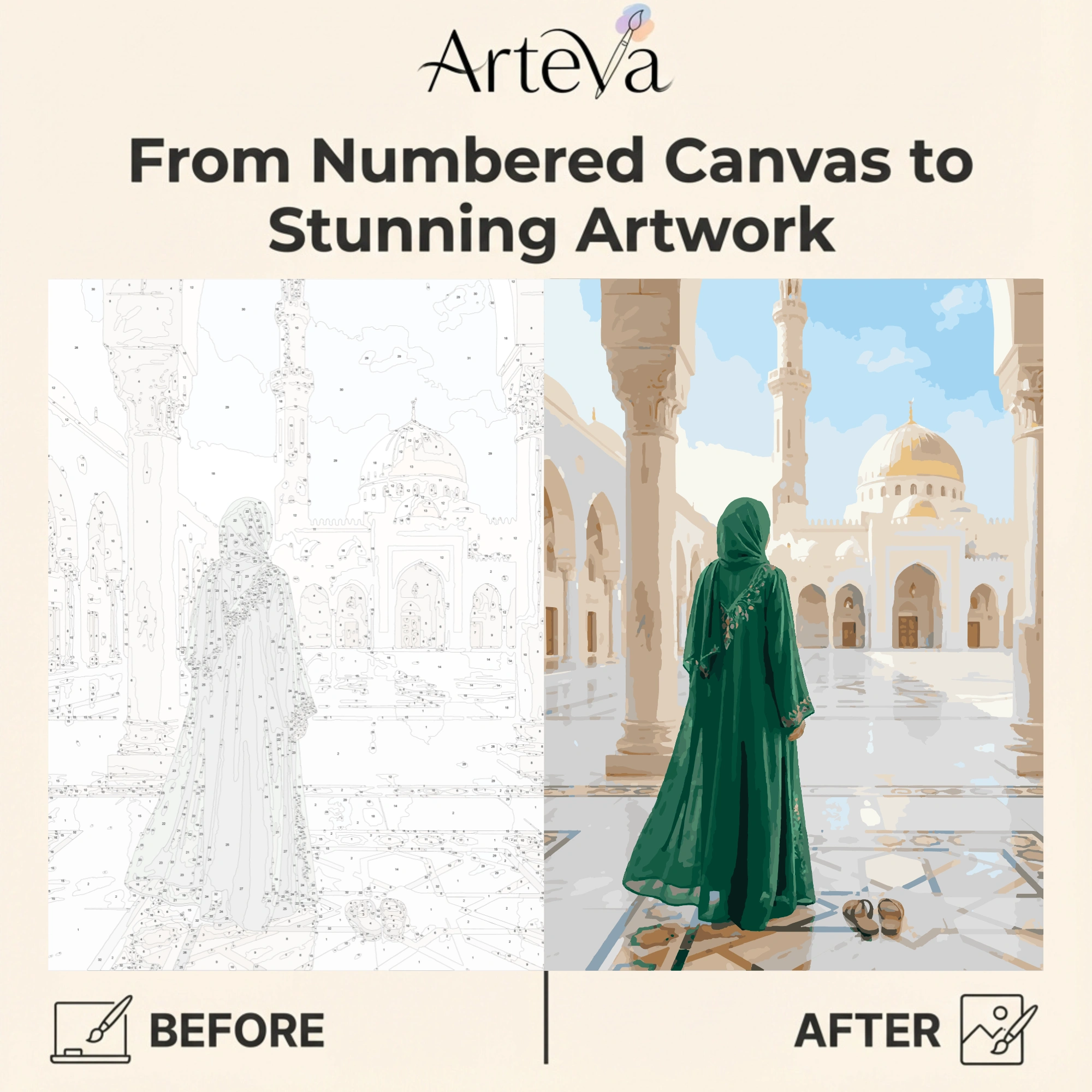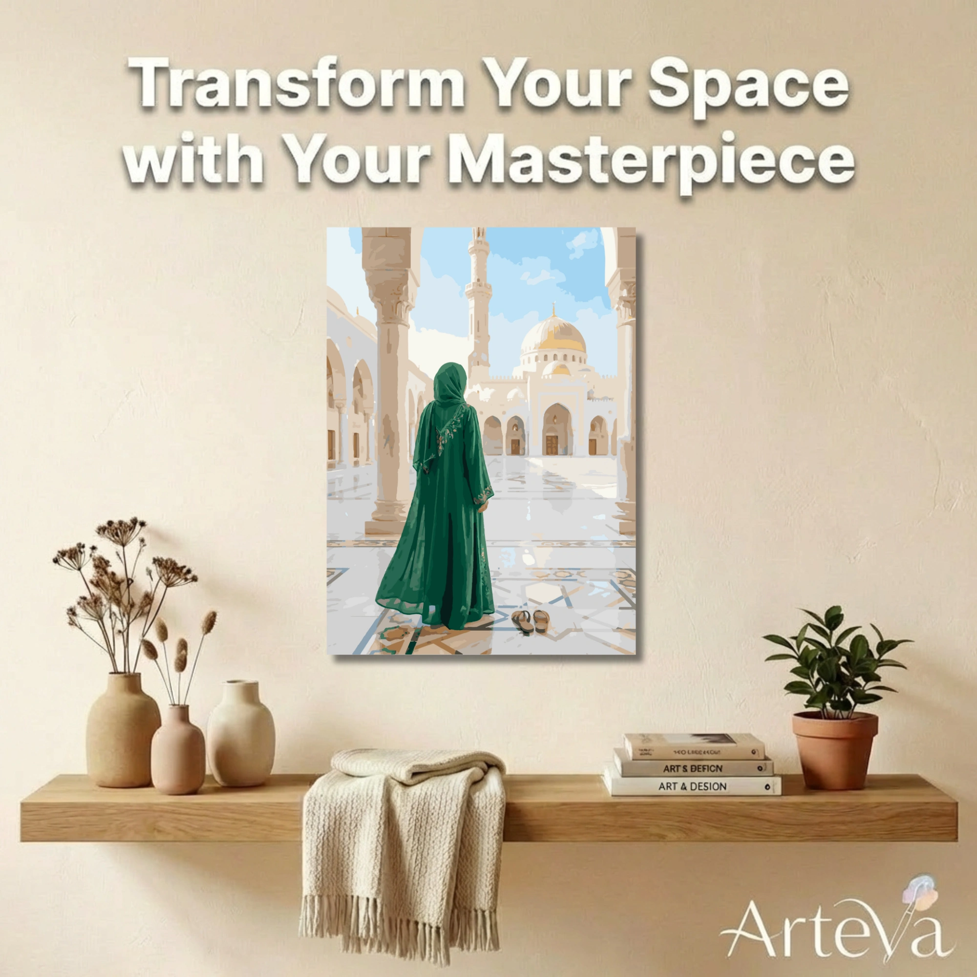 لوحة تلوين بالأرقام تجسد لحظة خشوع وطمأنينة لامرأة مسلمة في ساحة مسجد بيضاء، تجربة فنية هادئة للاسترخاء وتزيين المنزل.