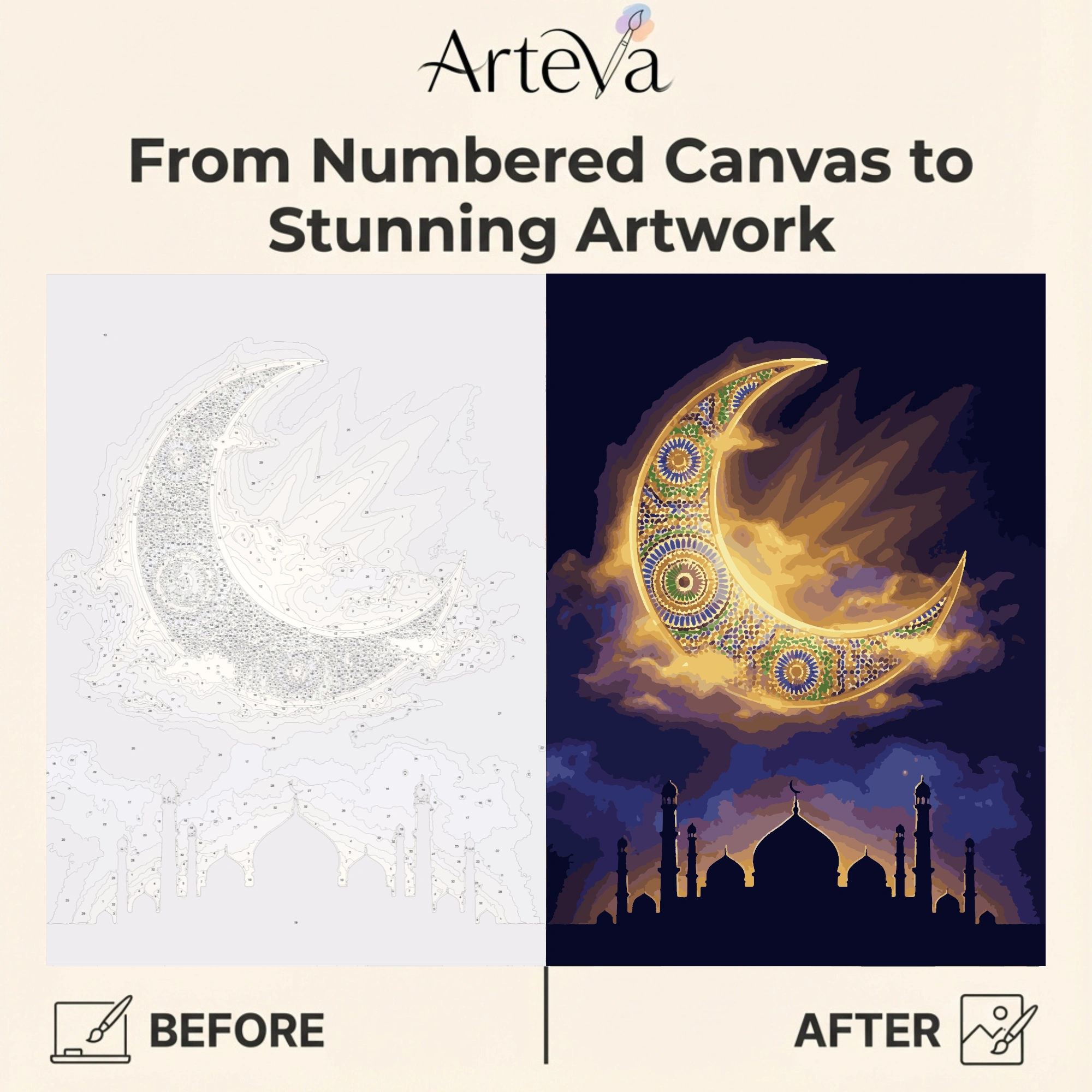 لوحة تلوين بالأرقام لهلال ذهبي مزخرف في سماء ليلية، تجسد روحانية رمضان والأعياد بألوان ساحرة.