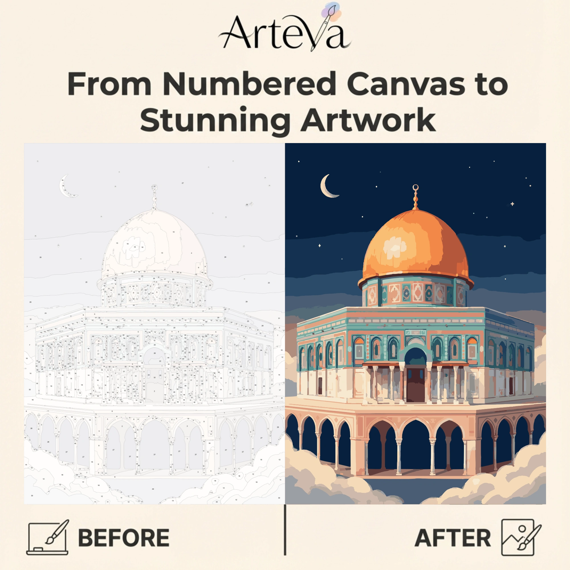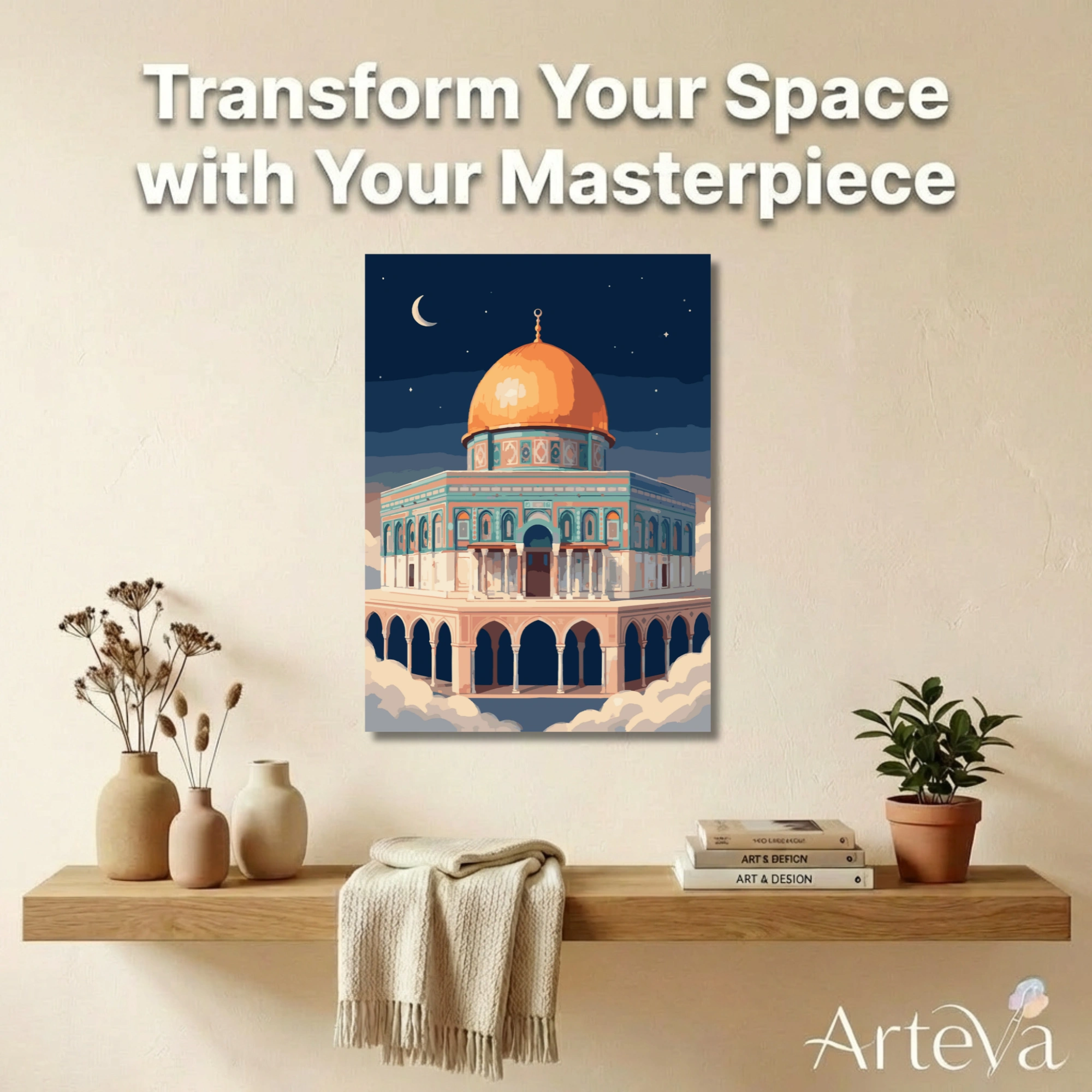 ليلة القدس هي لوحة تلوين بالأرقام تأسر جمال قبة الصخرة في ليلة هادئة تحت سماء زرقاء مزينة بالنجوم والهلال. القبة الذهبية تتألق بألوان دافئة، والزخارف الإسلامية تظهر بتفاصيل دقيقة.